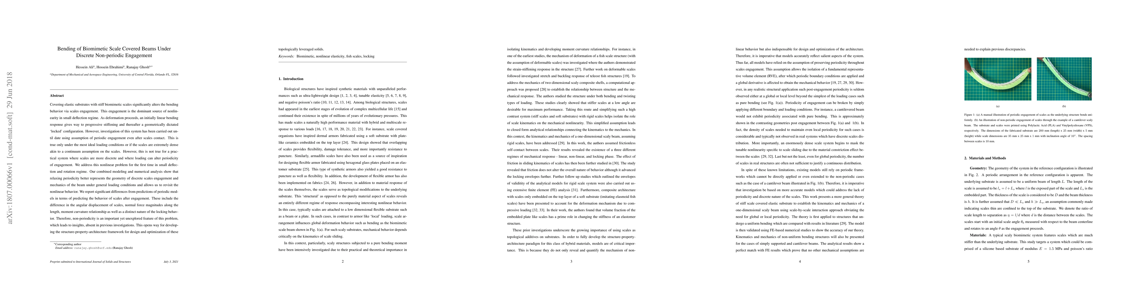 Covering elastic substrates with stiff biomimetic scales significantly alters the bending behavior via scales engagement. This engagement is the dominant source of nonlinearity in small deflection regime. As deformation proceeds, an initially linear bending response gives way to progressive stiffening and thereafter a geometrically dictated 'locked' configuration. However, investigation of this system has been carried out until date using assumption of periodic engagement even after scales contact. This is true only under the most ideal loading conditions or if the scales are extremely dense akin to a continuum assumption on the scales. However, this is not true for a practical system where scales are more discrete and where loading can alter periodicity of engagement. We address this nonlinear problem for the first time in small deflection and rotation regime. Our combined modeling and numerical analysis show that relaxing periodicity better represents the geometry of discrete scales engagement and mechanics of the beam under general loading conditions and allows us to revisit the nonlinear behavior. We report significant differences from predictions of periodic models in terms of predicting the behavior of scales after engagement. These include the difference in the angular displacement of scales, normal force magnitudes along the length, moment curvature relationship as well as a distinct nature of the locking behavior. Therefore, non-periodicity is an important yet unexplored feature of this problem, which leads to insights, absent in previous investigations. This opens way for developing the structure-property-architecture framework for design and optimization of these topologically leveraged solids.