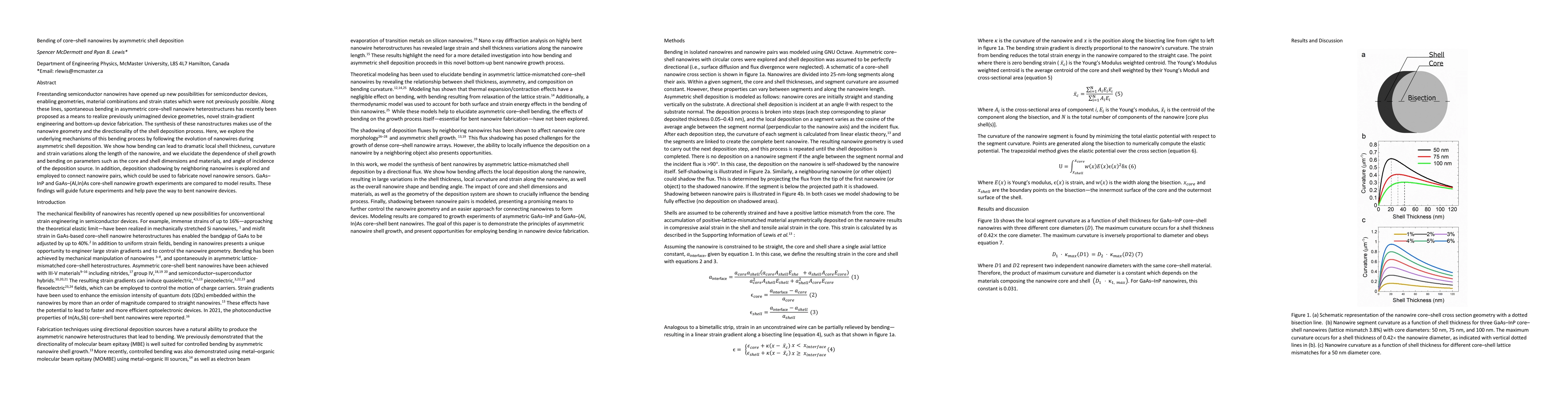 This paper investigates the mechanisms behind the spontaneous bending of core-shell semiconductor nanowires during asymmetric shell deposition, revealing how this process creates local variations in shell thickness, curvature, and strain. The study also explores how bending can be controlled by parameters like core and shell dimensions and deposition angle, and discusses the potential for using shadowing effects to connect nanowire pairs for sensor fabrication.