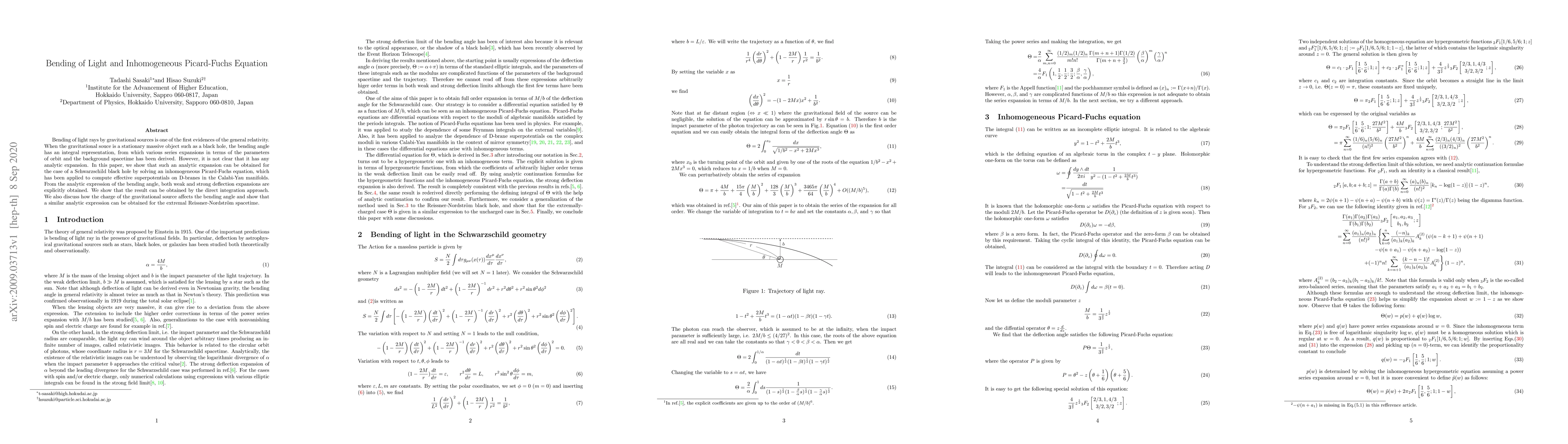 Bending of light rays by gravitational sources is one of the first evidences of the general relativity. When the gravitational souce is a stationary massive object such as a black hole, the bending angle has an integral representation, from which various series expansions in terms of the parameters of orbit and the background spacetime has been derived. However, it is not clear that it has any analytic expansion. In this paper, we show that such an analytic expansion can be obtained for the case of a Schwarzschild black hole by solving an inhomogeneous Picard-Fuchs equation, which has been applied to compute effective superpotentials on D-branes in the Calabi-Yau manifolds. From the analytic expression of the bending angle, both weak and strong deflection expansions are explicitly obtained. We show that the result can be obtained by the direct integration approach. We also discuss how the charge of the gravitational source affects the bending angle and show that a similar analytic expression can be obtained for the extremal Reissner-Nordstroem spacetime.