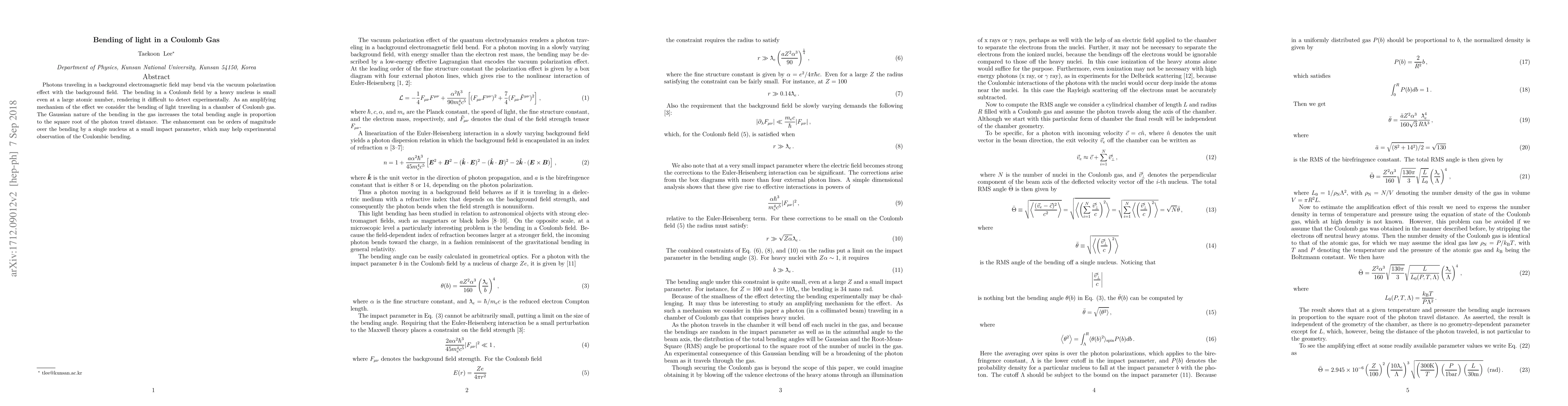 This paper explores the bending of light due to vacuum polarization in a Coulomb gas, where the Gaussian nature of the bending increases the total angle in proportion to the square root of the photon travel distance, potentially enhancing the effect for easier experimental detection.