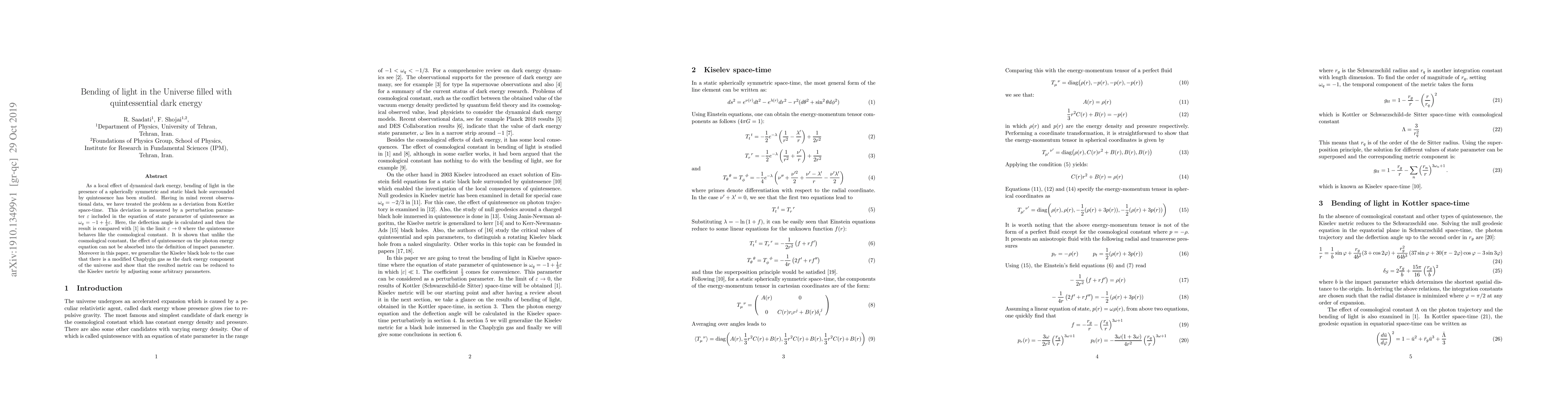 As a local effect of dynamical dark energy, bending of light in the presence of a spherically symmetric and static black hole surrounded by quintessence has been studied. Having in mind recent observational data, we have treated the problem as a deviation from Kottler space-time. This deviation is measured by a perturbation parameter $\varepsilon$ included in the equation of state parameter of quintessence as $\omega_q=-1+\frac{1}{3}\varepsilon$. Here, the deflection angle is calculated and then the result is compared with \cite{Arakida:2011th} in the limit $\varepsilon\rightarrow 0$ where the quintessence behaves like the cosmological constant. It is shown that unlike the cosmological constant, the effect of quintessence on the photon energy equation can not be absorbed into the definition of impact parameter. Moreover in this paper, we generalize the Kiselev black hole to the case that there is a modified Chaplygin gas as the dark energy component of the universe and show that the resulted metric can be reduced to the Kiselev metric by adjusting some arbitrary parameters.