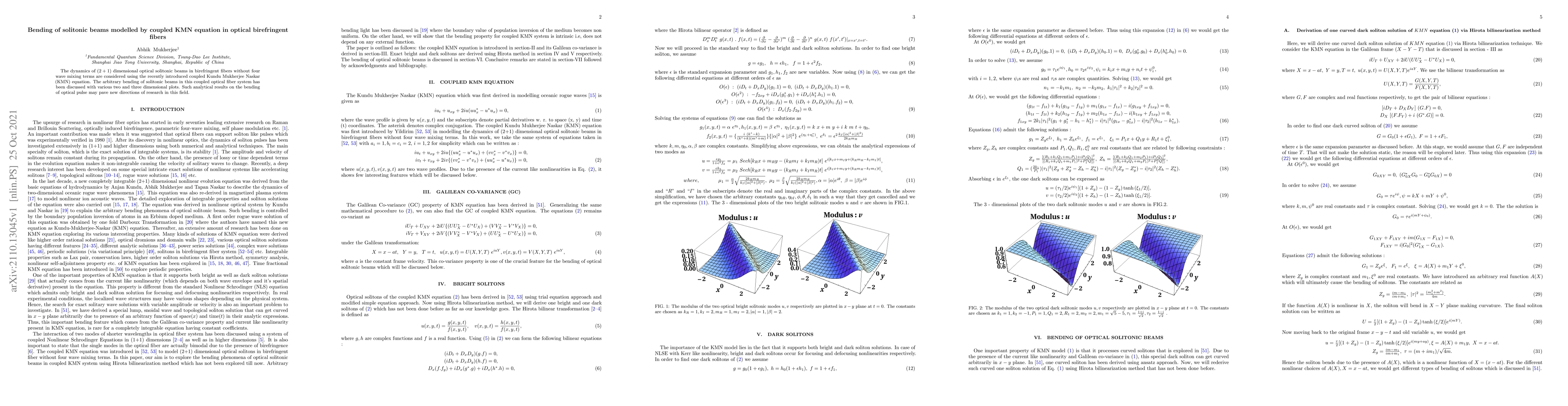 This paper investigates the dynamics of solitonic beams in birefringent optical fibers using the coupled Kundu Mukherjee Naskar (KMN) equation, focusing on their bending behavior without four wave mixing terms. Analytical results and various 2D and 3D plots illustrate the bending characteristics of these optical solitons, potentially opening new research avenues in optical fiber dynamics.