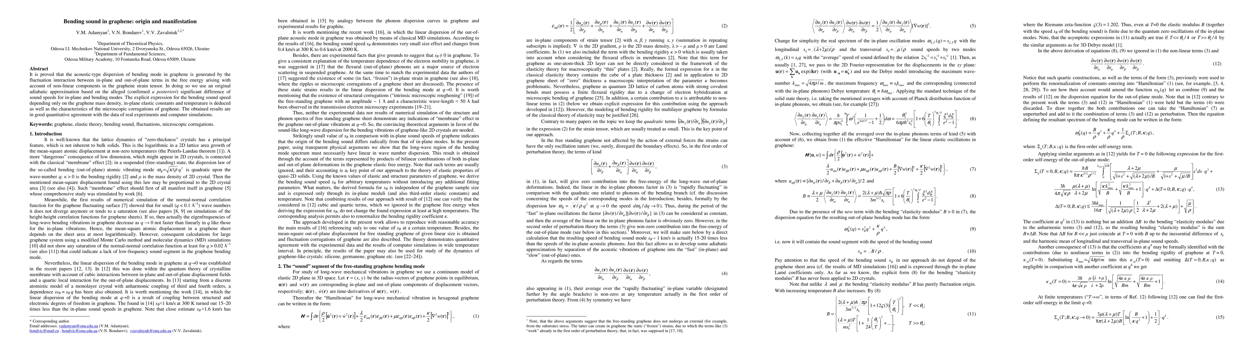 This study reveals the acoustic-type dispersion of bending modes in graphene, showing it arises from interactions between in-plane and out-of-plane terms in the free energy, with a new adiabatic approximation. The bending sound speed and microscopic corrugations are explicitly calculated, matching experimental and simulation data.