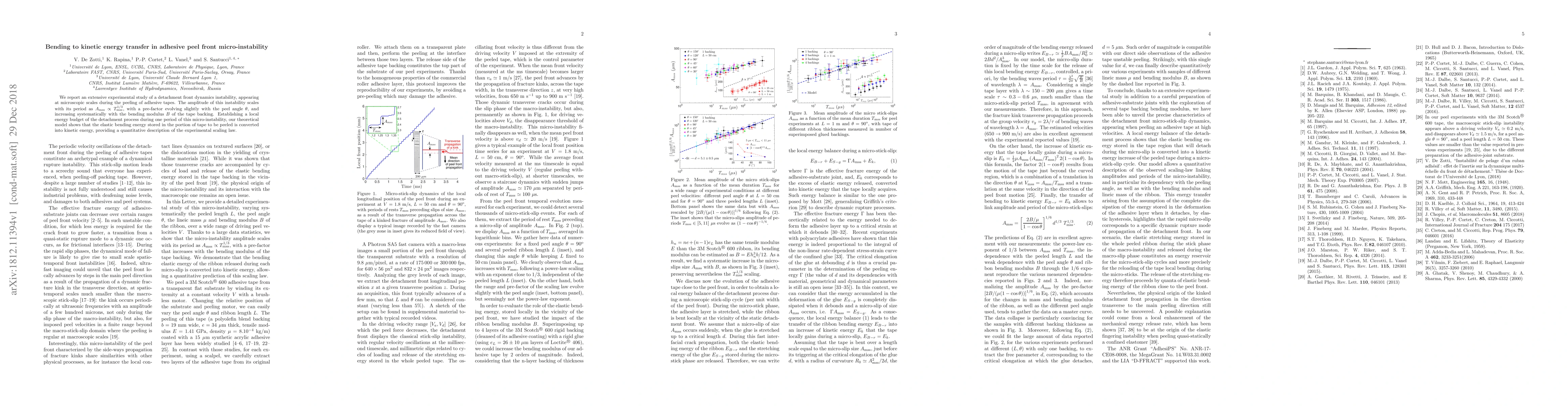 We report an extensive experimental study of a detachment front dynamics instability, appearing at microscopic scales during the peeling of adhesive tapes. The amplitude of this instability scales with its period as $A_{\text{mss}} \propto T_{\text{mss}}^{1/3}$, with a pre-factor evolving slightly with the peel angle $\theta$, and increasing systematically with the bending modulus $B$ of the tape backing. Establishing a local energy budget of the detachment process during one period of this micro-instability, our theoretical model shows that the elastic bending energy stored in the portion of tape to be peeled is converted into kinetic energy, providing a quantitative description of the experimental scaling law.