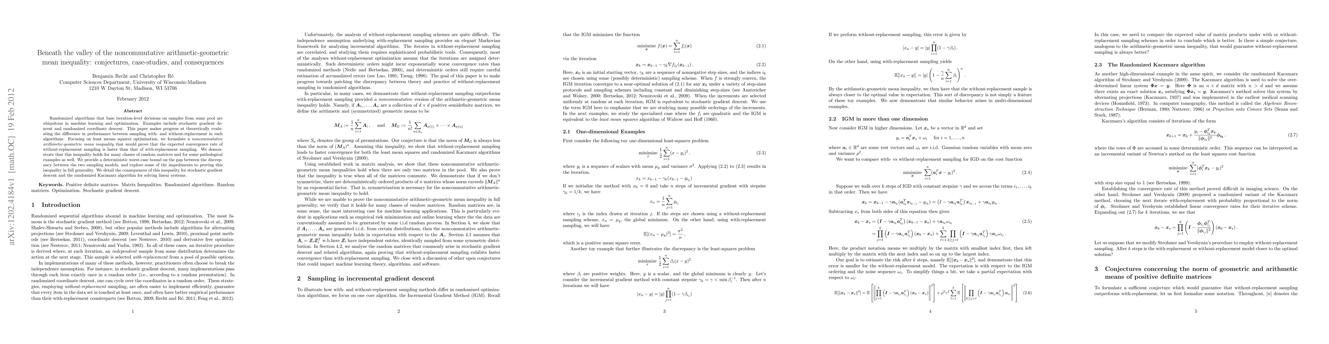 Randomized algorithms that base iteration-level decisions on samples from some pool are ubiquitous in machine learning and optimization. Examples include stochastic gradient descent and randomized coordinate descent. This paper makes progress at theoretically evaluating the difference in performance between sampling with- and without-replacement in such algorithms. Focusing on least means squares optimization, we formulate a noncommutative arithmetic-geometric mean inequality that would prove that the expected convergence rate of without-replacement sampling is faster than that of with-replacement sampling. We demonstrate that this inequality holds for many classes of random matrices and for some pathological examples as well. We provide a deterministic worst-case bound on the gap between the discrepancy between the two sampling models, and explore some of the impediments to proving this inequality in full generality. We detail the consequences of this inequality for stochastic gradient descent and the randomized Kaczmarz algorithm for solving linear systems.