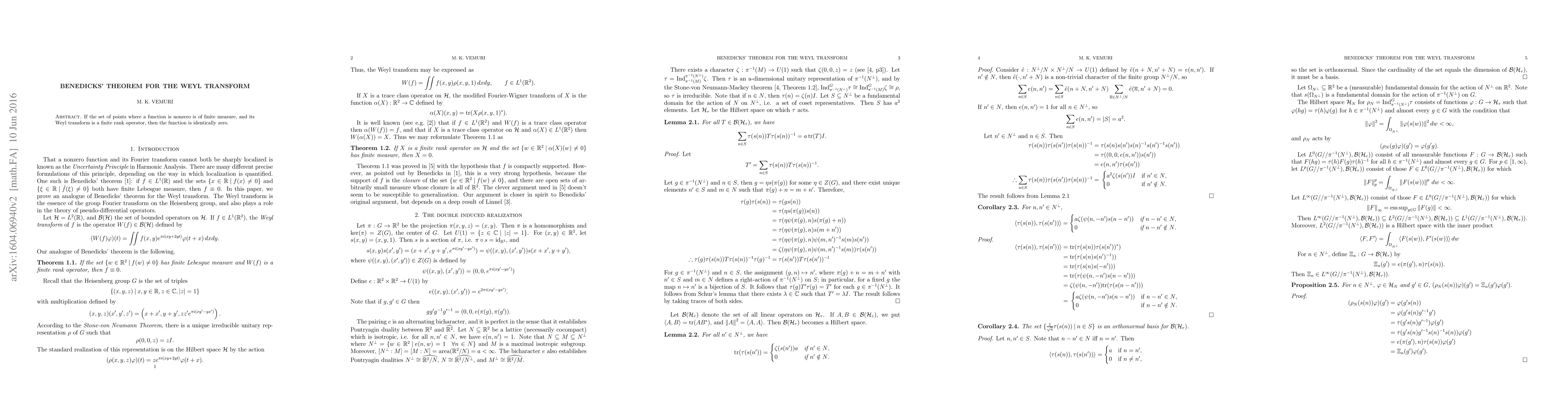 If the set of points where a function is nonzero is of finite measure, and its Weyl transform is a finite rank operator, then the function is identically zero.