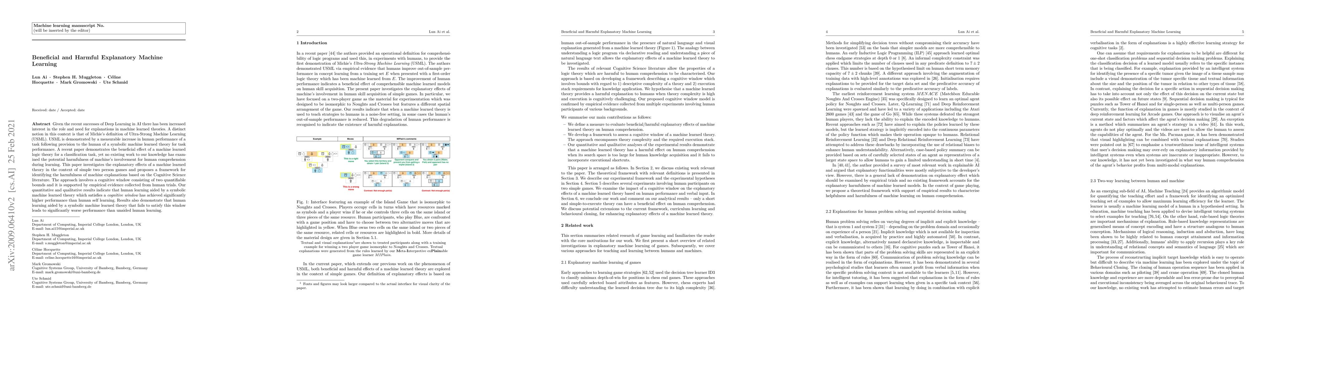 Given the recent successes of Deep Learning in AI there has been increased interest in the role and need for explanations in machine learned theories. A distinct notion in this context is that of Michie's definition of Ultra-Strong Machine Learning (USML). USML is demonstrated by a measurable increase in human performance of a task following provision to the human of a symbolic machine learned theory for task performance. A recent paper demonstrates the beneficial effect of a machine learned logic theory for a classification task, yet no existing work to our knowledge has examined the potential harmfulness of machine's involvement for human comprehension during learning. This paper investigates the explanatory effects of a machine learned theory in the context of simple two person games and proposes a framework for identifying the harmfulness of machine explanations based on the Cognitive Science literature. The approach involves a cognitive window consisting of two quantifiable bounds and it is supported by empirical evidence collected from human trials. Our quantitative and qualitative results indicate that human learning aided by a symbolic machine learned theory which satisfies a cognitive window has achieved significantly higher performance than human self learning. Results also demonstrate that human learning aided by a symbolic machine learned theory that fails to satisfy this window leads to significantly worse performance than unaided human learning.