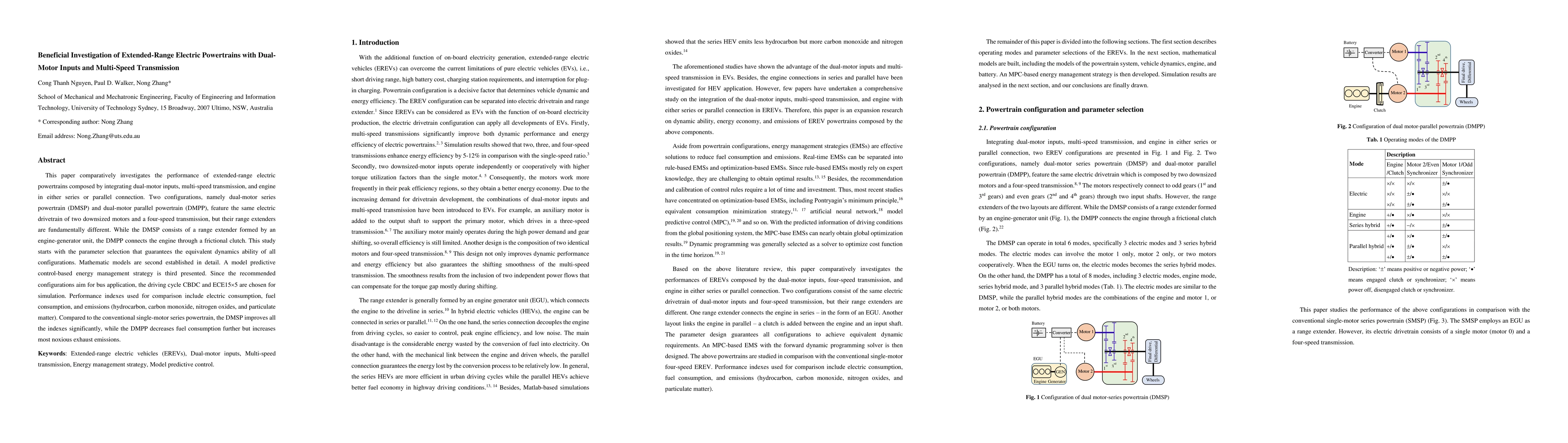 This paper compares the performance of extended-range electric powertrains with dual-motor inputs and multi-speed transmission, focusing on two configurations: dual-motor series and parallel powertrains. The study finds that the dual-motor series powertrain significantly improves electric and fuel efficiency and emissions, while the dual-motor parallel powertrain further reduces fuel consumption but increases harmful emissions.