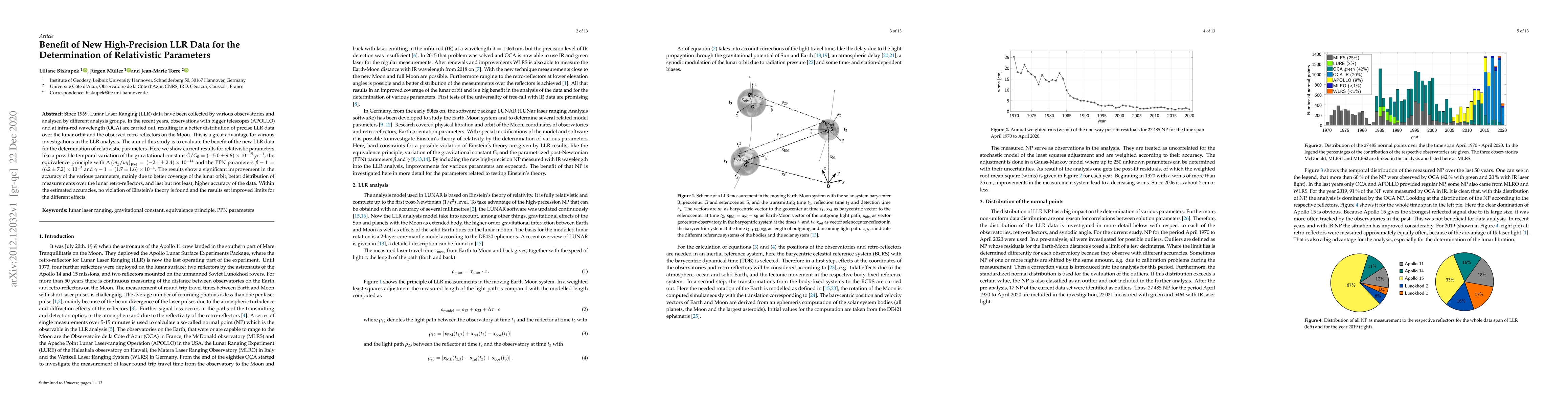 Since 1969, Lunar Laser Ranging (LLR) data have been collected by various observatories and analysed by different analysis groups. In the recent years, observations with bigger telescopes (APOLLO) and at infra-red wavelength (OCA) are carried out, resulting in a better distribution of precise LLR data over the lunar orbit and the observed retro-reflectors on the Moon. This is a great advantage for various investigations in the LLR analysis. The aim of this study is to evaluate the benefit of the new LLR data for the determination of relativistic parameters. Here we show current results for relativistic parameters like a possible temporal variation of the gravitational constant $\dot{G}/G_0 = (-5.0 \pm 9.6) \times 10^{-15} \, \mathrm{yr}^{-1}$, the equivalence principle with $\Delta\left(m_g/m_i\right)_{\mathrm{EM}} = (-2.1 \pm 2.4)\times10^{-14}$ and the PPN parameters $\beta-1 = (6.2 \pm 7.2) \times 10^{-5}$ and $\gamma-1 = (1.7 \pm 1.6) \times 10^{-4}$. The results show a significant improvement in the accuracy of the various parameters, mainly due to better coverage of the lunar orbit, better distribution of measurements over the lunar retro-reflectors, and last but not least, higher accuracy of the data. Within the estimated accuracies, no violation of Einstein's theory is found and the results set improved limits for the different effects.