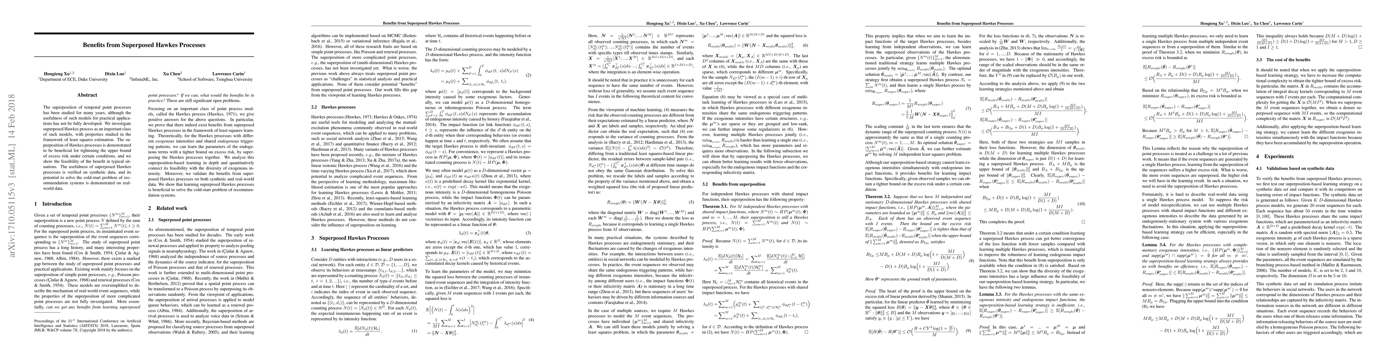 Researchers show that superposing Hawkes processes can improve risk bounds for excess events in certain conditions, and demonstrate its potential to solve the cold-start problem in recommendation systems.
