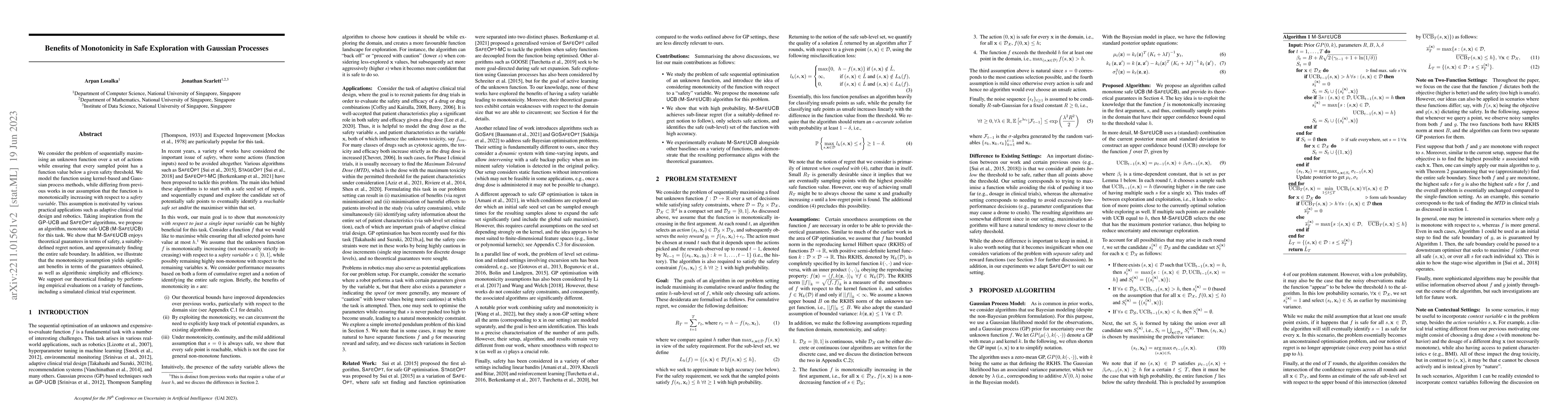 This paper proposes a new algorithm, M-SafeUCB, for safely exploring an unknown monotonically increasing function using Gaussian processes, ensuring all sampled points remain below a safety threshold. The monotonicity assumption enhances theoretical guarantees, algorithmic simplicity, and efficiency, as demonstrated through empirical evaluations.