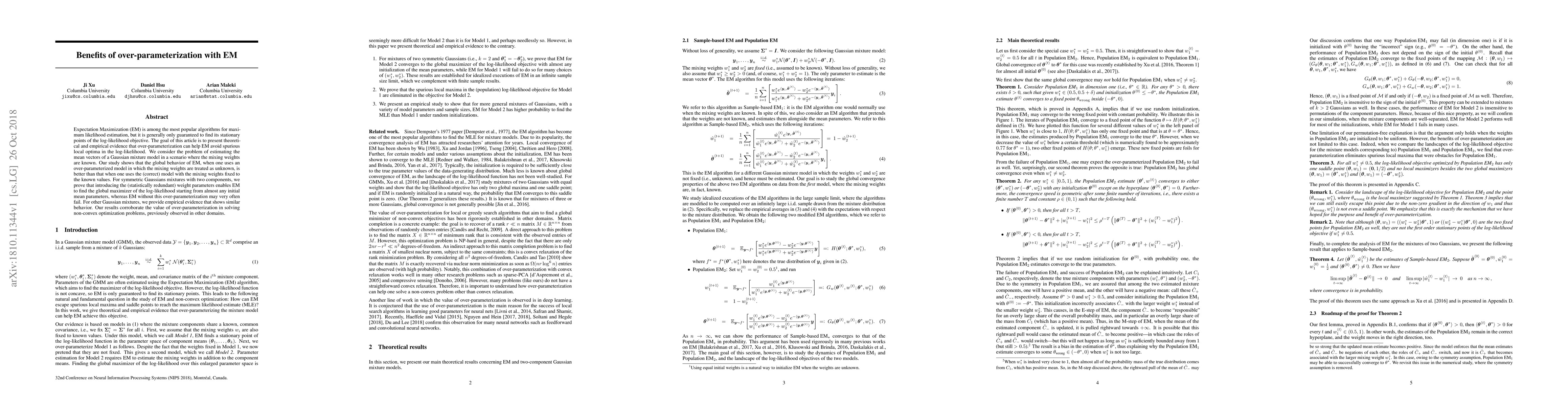 Expectation Maximization (EM) is among the most popular algorithms for maximum likelihood estimation, but it is generally only guaranteed to find its stationary points of the log-likelihood objective. The goal of this article is to present theoretical and empirical evidence that over-parameterization can help EM avoid spurious local optima in the log-likelihood. We consider the problem of estimating the mean vectors of a Gaussian mixture model in a scenario where the mixing weights are known. Our study shows that the global behavior of EM, when one uses an over-parameterized model in which the mixing weights are treated as unknown, is better than that when one uses the (correct) model with the mixing weights fixed to the known values. For symmetric Gaussians mixtures with two components, we prove that introducing the (statistically redundant) weight parameters enables EM to find the global maximizer of the log-likelihood starting from almost any initial mean parameters, whereas EM without this over-parameterization may very often fail. For other Gaussian mixtures, we provide empirical evidence that shows similar behavior. Our results corroborate the value of over-parameterization in solving non-convex optimization problems, previously observed in other domains.