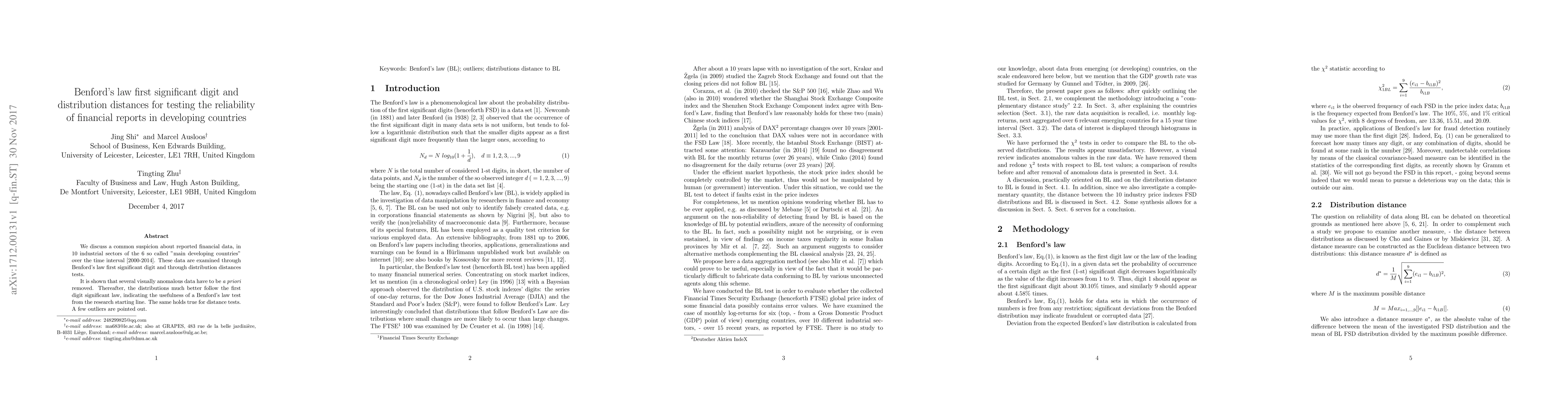 Summary: This study examines financial data from 10 industrial sectors in six developing countries (2000-2014) using Benford's law and distribution distance tests to assess data reliability. After removing anomalous data, the remaining distributions better conform to Benford's law, highlighting its utility in scrutinizing financial reports.