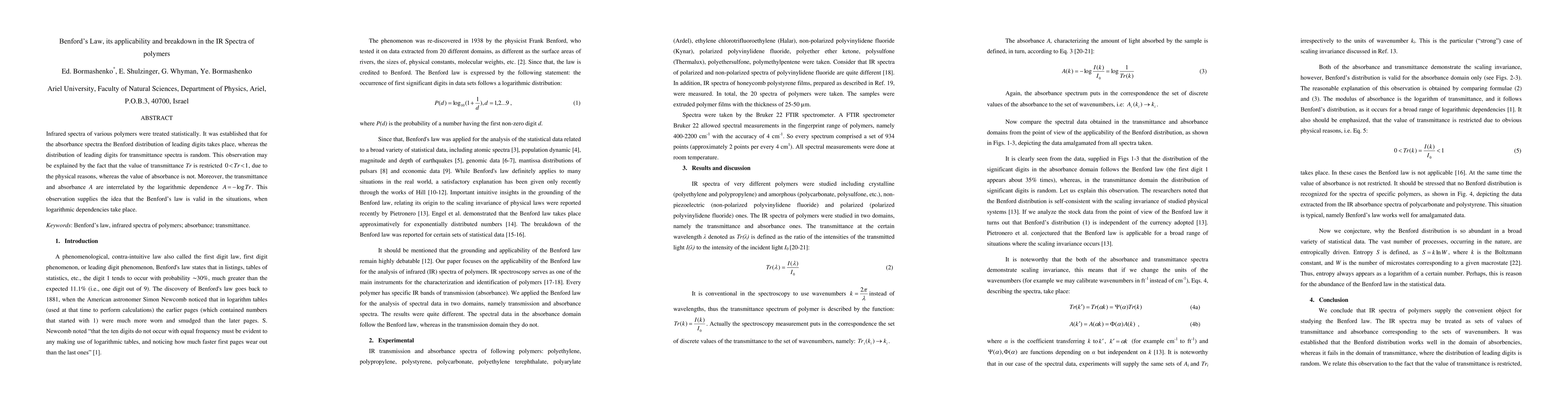 Infrared spectra of various polymers were treated statistically. It was established that for the absorbance spectra the Benford distribution of leading digits takes place, whereas the distribution of leading digits for transmittance spectra is random. This observation may be explained by the fact that the value of transmittance Tr is restricted, due to the physical reasons, whereas the value of absorbance is not. Moreover, the transmittance and absorbance A are interrelated by the logarithmic dependence . This observation supplies the idea that the Benford's law is valid in the situations, when logarithmic dependencies take place.