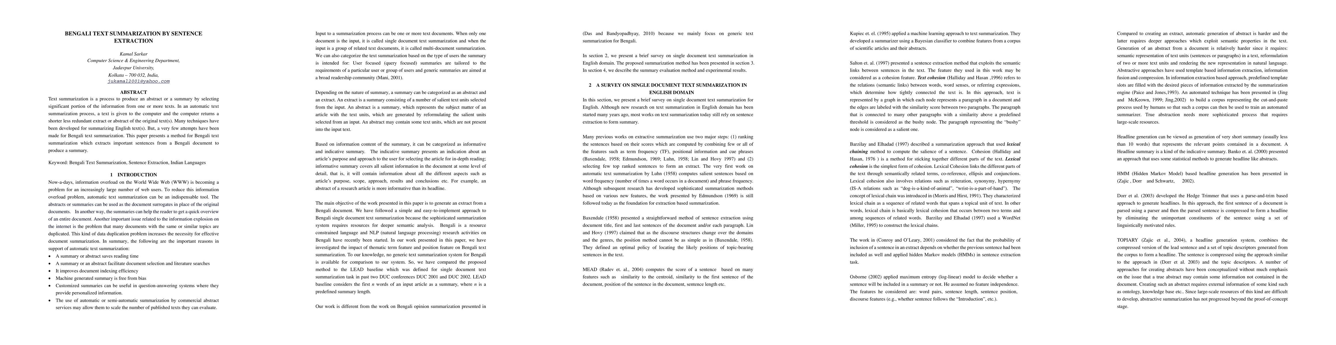This paper proposes a method for Bengali text summarization by extracting significant sentences from Bengali documents to generate concise summaries. The approach aims to address the scarcity of techniques for summarizing Bengali texts.