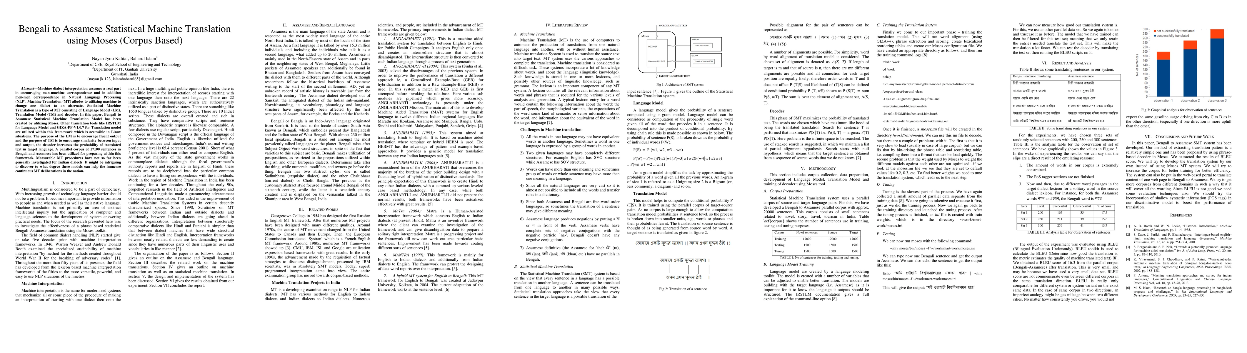 This paper develops a Bengali to Assamese Statistical Machine Translation model using Moses, incorporating IRSTLM for Language Model and GIZA-PP-V1.0.7 for Translation Model. A parallel corpus of 17,100 sentences is used for training, aiming to enhance fluency and similarity in translation outputs.