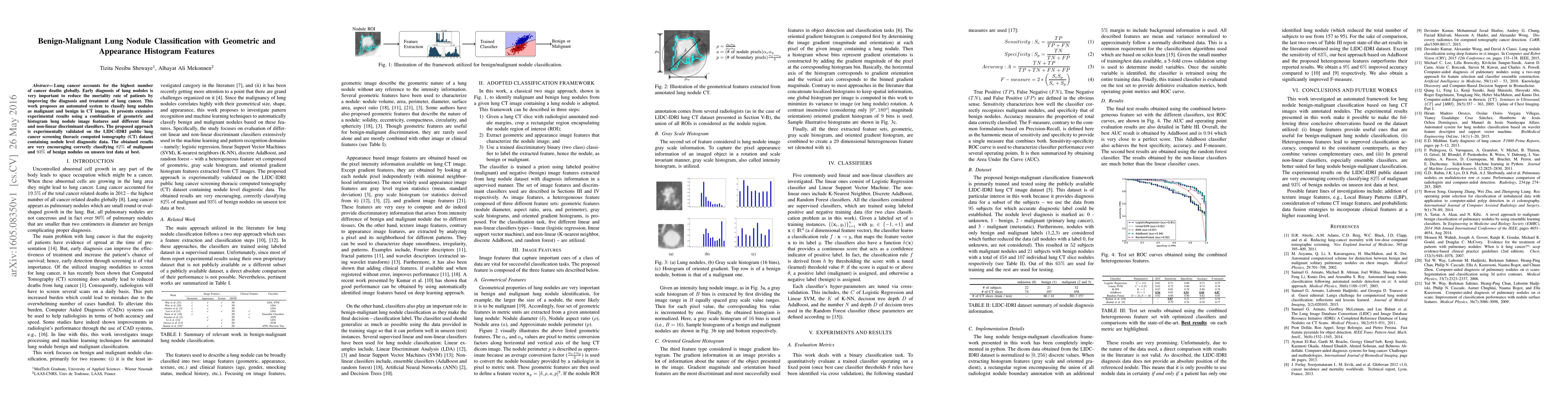 A machine learning approach using geometric and appearance features classifies lung nodules as benign or malignant with 82% accuracy for malignancies and 93% accuracy for benign nodules on unseen data.