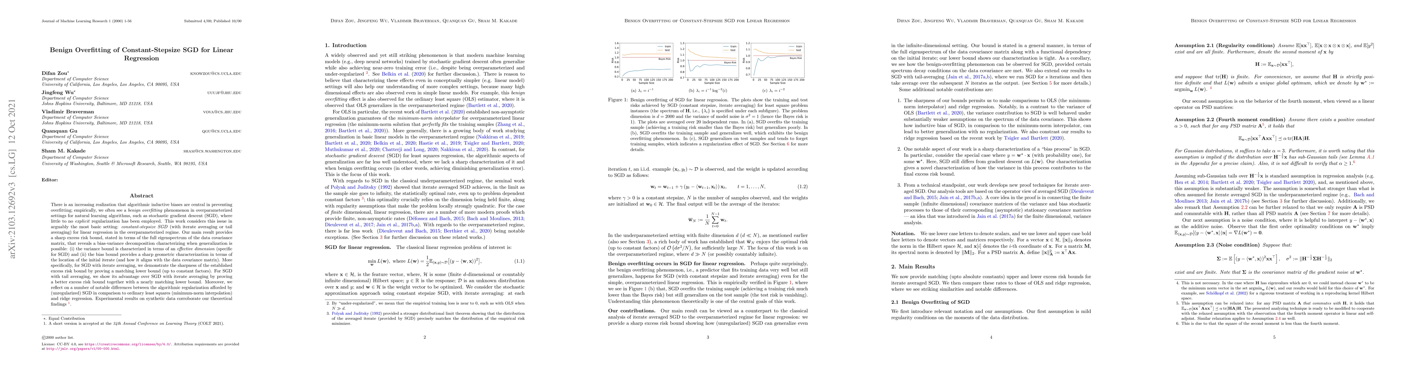 This paper investigates the phenomenon of benign overfitting in constant-stepsize SGD for linear regression, providing a sharp excess risk bound that reveals a bias-variance decomposition. It demonstrates that SGD with iterate averaging and tail averaging can generalize well in overparameterized settings, highlighting differences in algorithmic regularization compared to ordinary least squares and ridge regression, with corroborating experimental results.