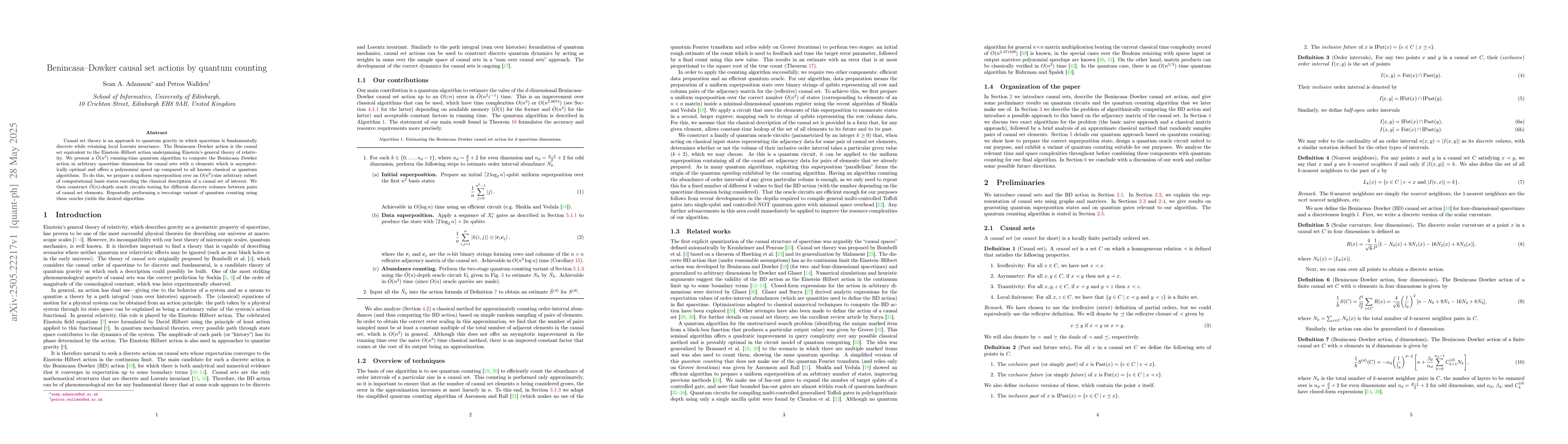 The development of a quantum algorithm with asymptotically optimal running time for computing the Benincasa--Dowker action in causal set theory.
