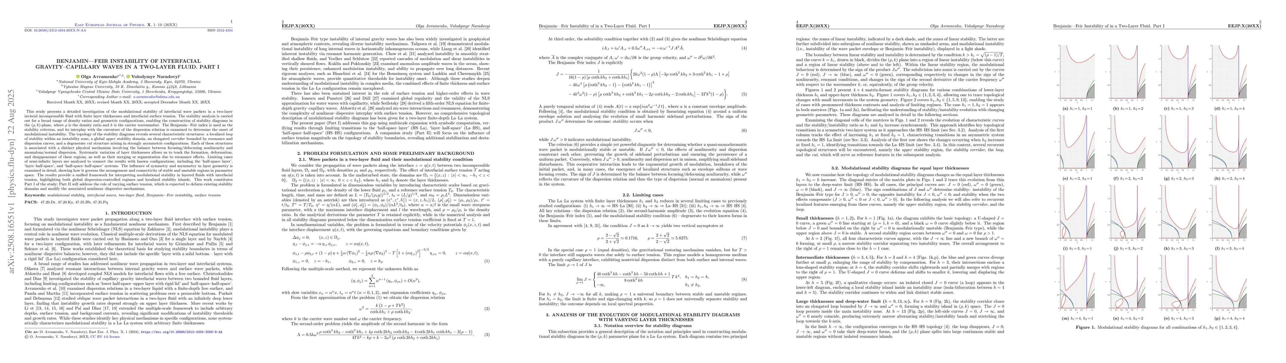 This study presents a detailed investigation of the modulational stability of interfacial wave packets in a two-layer inviscid incompressible fluid with finite layer thicknesses and interfacial surface tension. The stability analysis is carried out for a broad range of density ratios and geometric configurations, enabling the construction of stability diagrams in the (\rho,k) -plane, where \rho is the density ratio and k is the carrier wavenumber. The Benjamin-Feir index is used as the stability criterion, and its interplay with the curvature of the dispersion relation is examined to determine the onset of modulational instability. The topology of the stability diagrams reveals several characteristic structures: a localized loop of stability within an instability zone, a global upper stability domain, an elongated corridor bounded by resonance and dispersion curves, and a degenerate cut structure arising in strongly asymmetric configurations. Each of these structures is associated with a distinct physical mechanism involving the balance between focusing/defocusing nonlinearity and anomalous/normal dispersion. Systematic variation of layer thicknesses allows us to track the formation, deformation, and disappearance of these regions, as well as their merging or segmentation due to resonance effects. Limiting cases of semi-infinite layers are analyzed to connect the results with known configurations, including the `half-space--layer', `layer--half-space', and `half-space--half-space' systems. The influence of symmetry and asymmetry in layer geometry is examined in detail, showing how it governs the arrangement and connectivity of stable and unstable regions in parameter space.