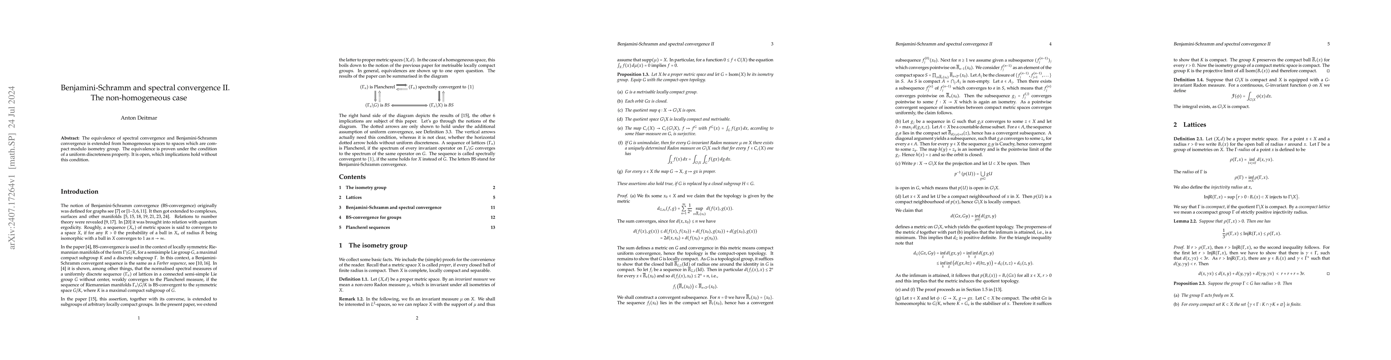This paper extends the equivalence of spectral convergence and Benjamini-Schramm convergence from homogeneous to non-homogeneous compact spaces, proving this under a uniform discreteness condition, while leaving open the implications without this condition.