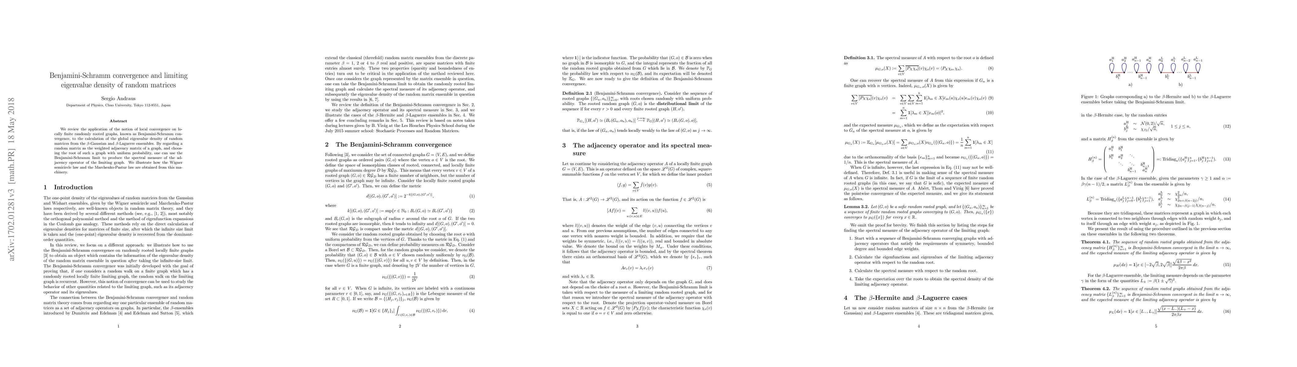This paper reviews the application of Benjamini-Schramm convergence to determine the limiting eigenvalue density of random matrices from beta-Gaussian and beta-Laguerre ensembles. It links the spectral measure of random graphs to the Wigner semicircle law and Marchenko-Pastur law.