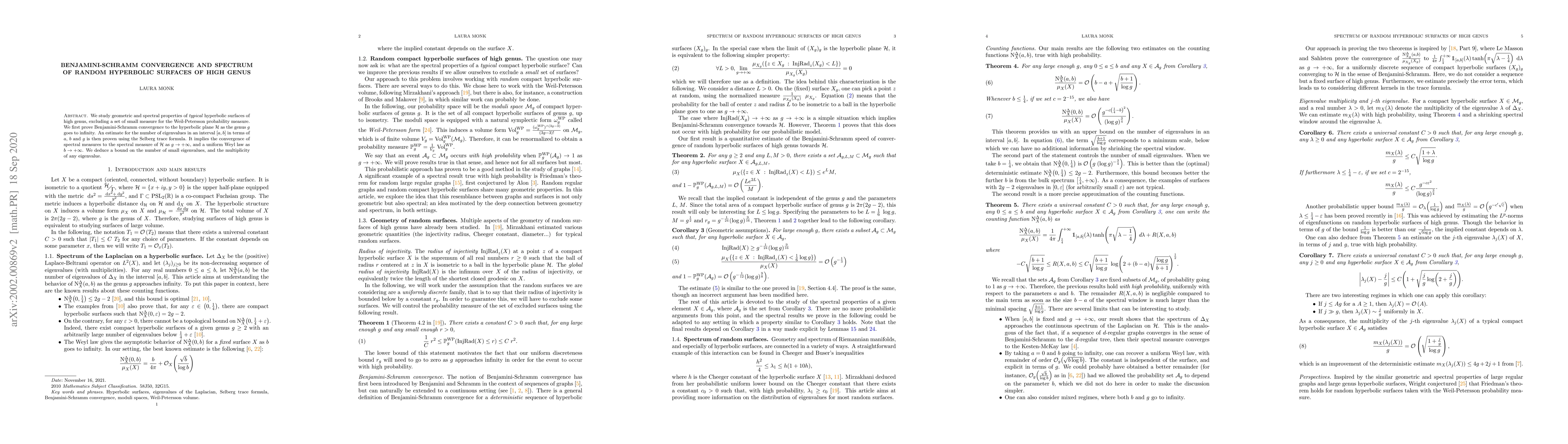 This paper investigates the geometric and spectral properties of high-genus hyperbolic surfaces, proving Benjamini-Schramm convergence to the hyperbolic plane and deriving an estimate for the number of eigenvalues using the Selberg trace formula, which leads to the convergence of spectral measures and a uniform Weyl law.