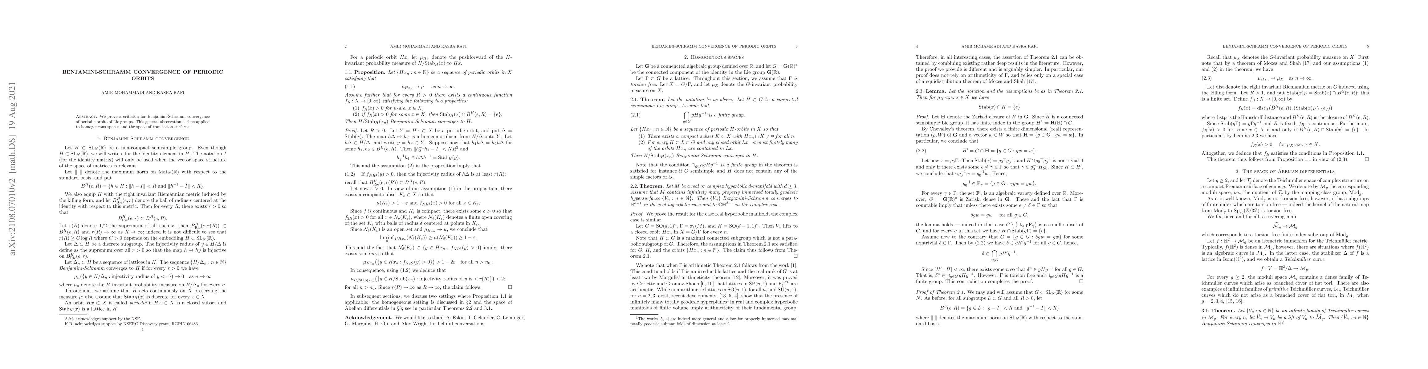 Summary: This paper establishes a criterion for Benjamini-Schramm convergence of periodic orbits within Lie groups, which is subsequently applied to understand the behavior of such orbits in homogeneous spaces and translation surfaces.