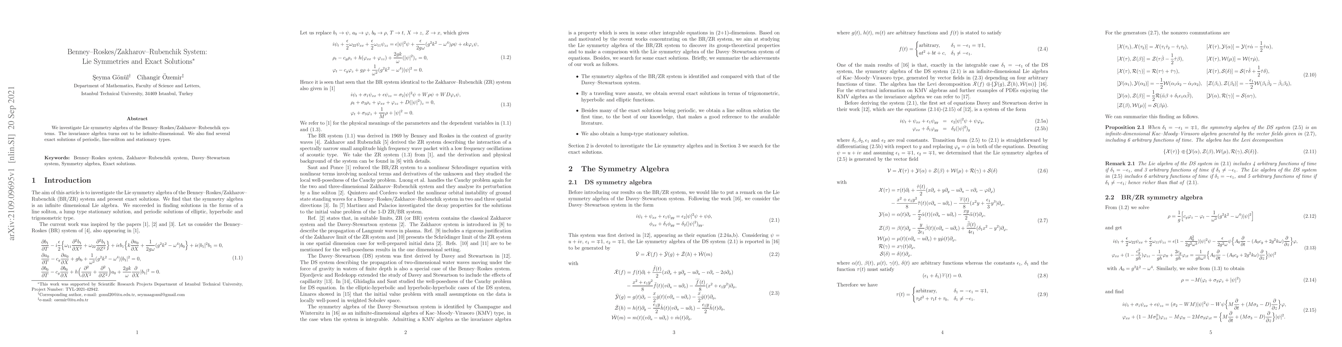 This paper explores the Lie symmetry algebra of the Benney-Roskes/Zakharov-Rubenchik systems, revealing an infinite-dimensional invariance algebra, and identifies several exact solutions including periodic, line-soliton, and stationary types.