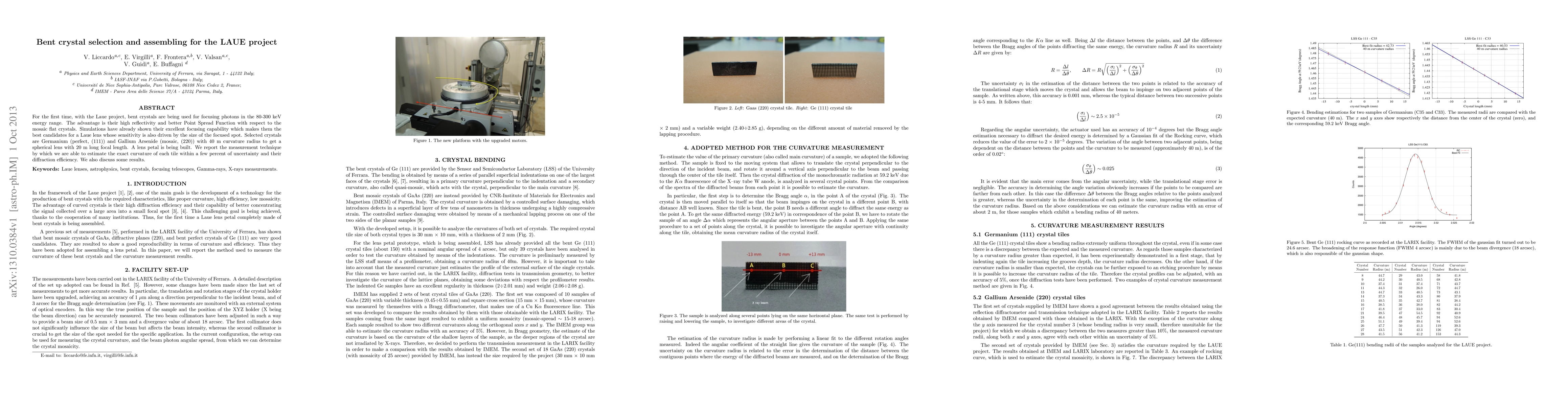 This paper details the selection and assembly of bent Germanium and Gallium Arsenide crystals for the LAUE project, highlighting their superior focusing capabilities in the 80-300 keV energy range. The study reports on precise measurement techniques to determine the curvature and diffraction efficiency of the crystals, aiming to create a high-sensitivity Laue lens.
