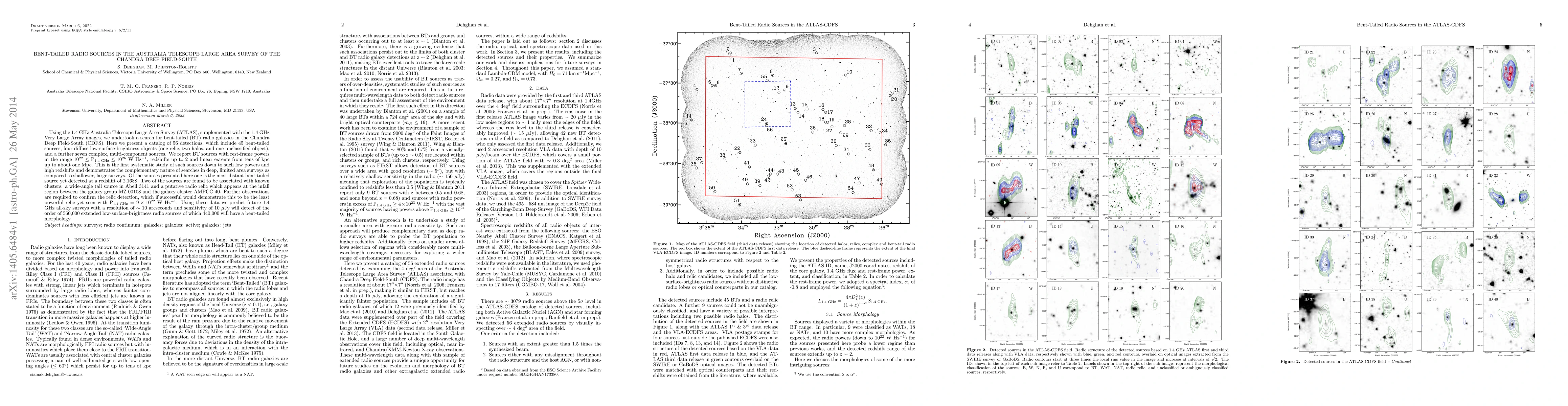 The study presents a catalog of 56 bent-tailed radio sources in the Chandra Deep Field-South using the Australia Telescope Large Area Survey and Very Large Array data. It includes 45 bent-tailed sources, diffuse low-surface-brightness objects, and complex multi-component sources with various redshifts and linear extents. The research highlights the first systematic study of such sources at high redshifts and low powers, predicting future surveys will detect around 560,000 extended low-surface-brightness radio sources with bent-tailed morphology.