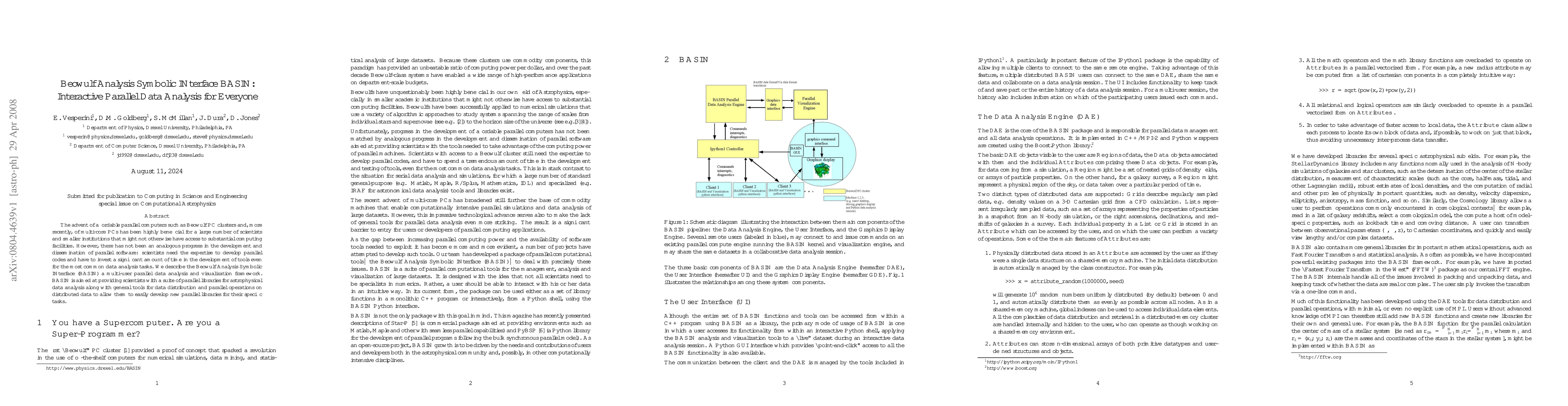 The paper introduces BASIN, a multi-user parallel data analysis framework for Beowulf clusters, designed to simplify the development of parallel codes and tools for scientists, especially in astrophysical data analysis. BASIN offers parallel libraries and general tools for data distribution and operations.