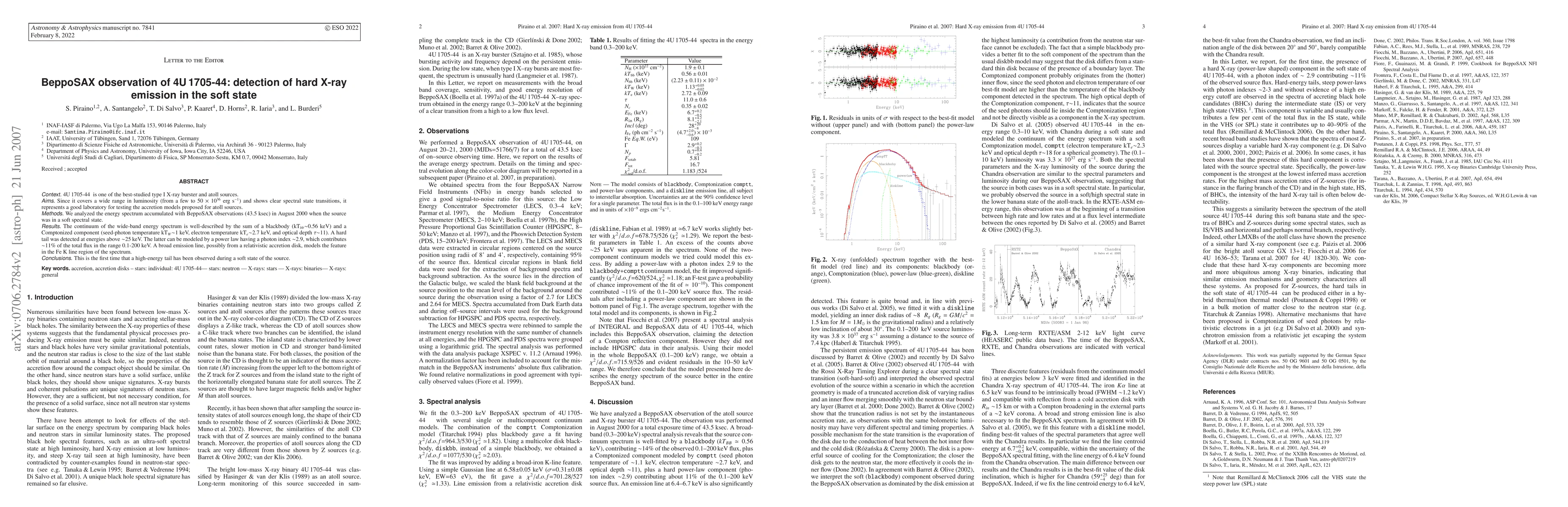 4U 1705-44 is one of the best studied type I X-ray burster and atoll sources. Since it covers a wide range in luminosity (from a few to 50 x 10^{36} erg s^{-1}) and shows clear spectral state transitions, it represents a good laboratory to test the accretion models proposed for atoll sources. We analysed the energy spectrum accumulated with BeppoSAX observations (43.5 ksec) in August 2000 when the source was in a soft spectral state. The continuum of the wide band energy spectrum is well described by the sum of a blackbody (kT_{bb}~0.56 keV) and a Comptonized component (seed-photon temperature kT_W~1 keV, electron temperature kT_e~2.7 keV, and optical depth ~11). A hard tail was detected at energies above ~25 keV. The latter can be modeled by a power law having a photon index ~2.9 which contributes ~11% of the total flux in the range 0.1-200 keV. A broad emission line, possibly from a relativistic accretion disk, models the feature in the Fe K line region of the spectrum. This is the first time that a high energy tail has been observed during a soft state of the source.
