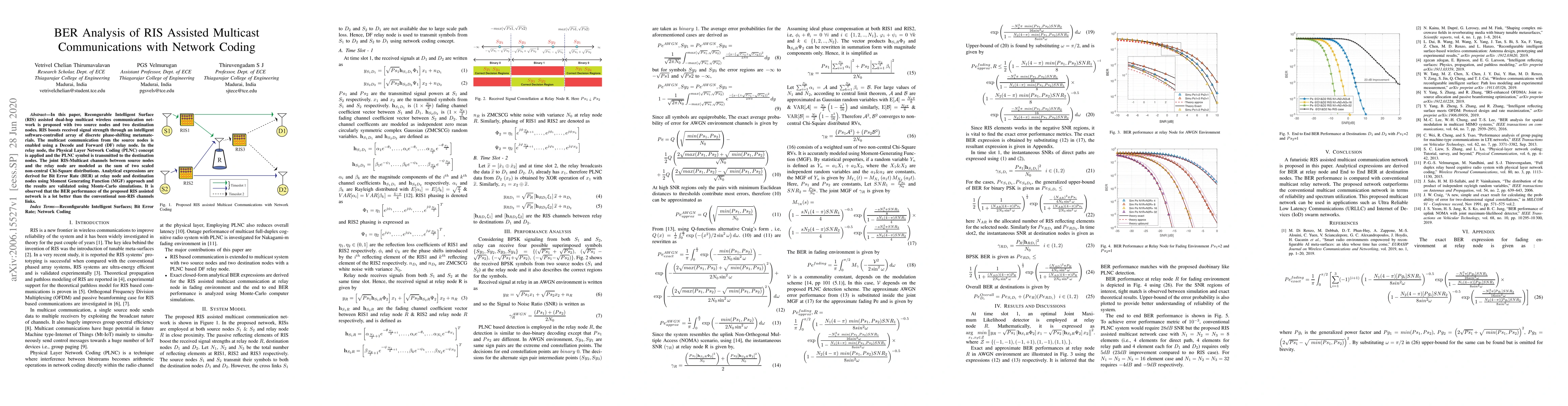 In this paper, Recofigurable Intelligent Surface (RIS) assisted dual-hop multicast wireless communication network is proposed with two source nodes and two destination nodes. RIS boosts received signal strength through an intelligent software-controlled array of discrete phase-shifting metamaterials. The multicast communication from the source nodes is enabled using a Decode and Forward (DF) relay node. In the relay node, the Physical Layer Network Coding (PLNC) concept is applied and the PLNC symbol is transmitted to the destination nodes. The joint RIS-Multicast channels between source nodes and the relay node are modeled as the sum of two scaled non-central Chi-Square distributions. Analytical expressions are derived for Bit Error Rate (BER) at relay node and destination nodes using Moment Generating Function (MGF) approach and the results are validated using Monte-Carlo simulations. It is observed that the BER performance of the proposed RIS assisted network is a lot better than the conventional non-RIS channels links.
