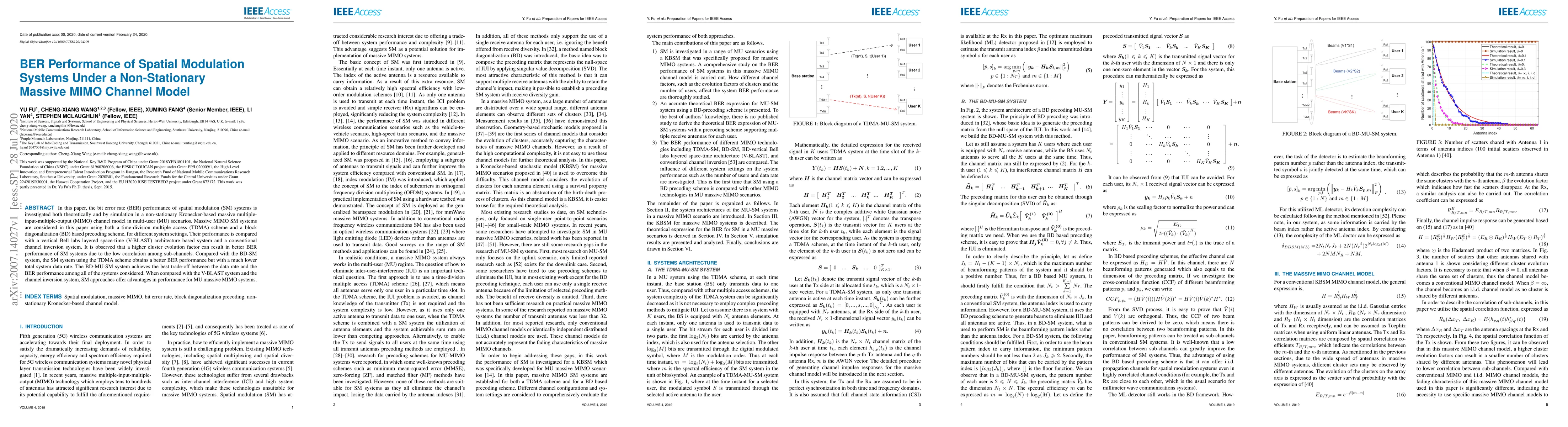 This paper investigates the performance of spatial modulation systems in non-stationary massive MIMO channels, finding that systems with lower correlation among sub-channels achieve better BER performance. SM systems outperform conventional architectures for multi-user MU massive MIMO scenarios.