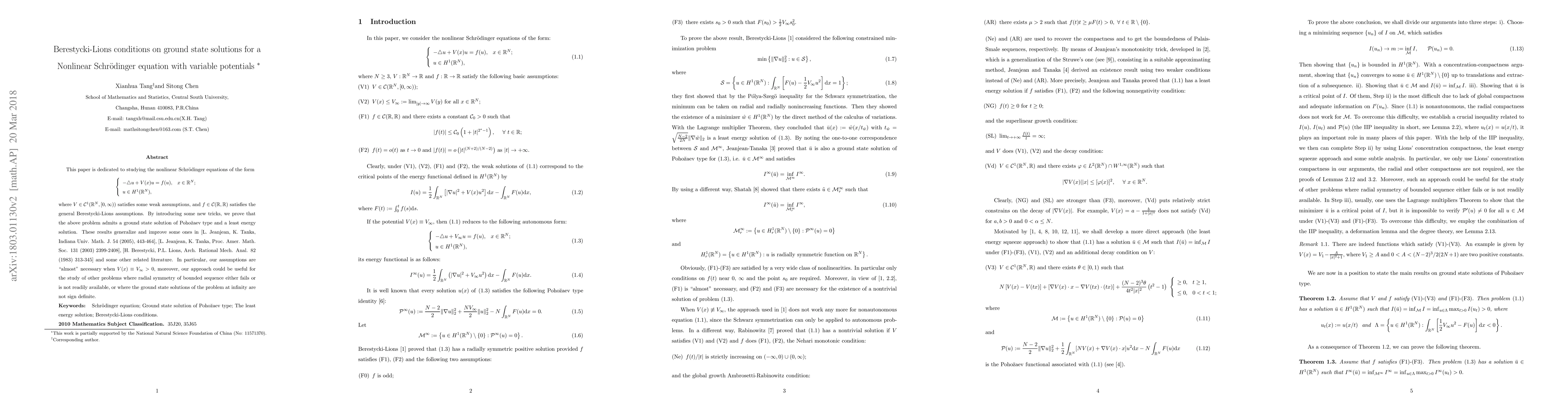 This paper is dedicated to studying the nonlinear Schr\"odinger equations of the form \begin{equation*}\label{KE} \left\{ \begin{array}{ll} -\triangle u+V(x)u=f(u), & x\in \R^N; u\in H^1(\R^N), \end{array} \right. \end{equation*} where $V\in \mathcal{C}^1(\R^N, [0, \infty))$ satisfies some weak assumptions, and $f\in \mathcal{C}(\R, \R)$ satisfies the general Berestycki-Lions assumptions. By introducing some new tricks, we prove that the above problem admits a ground state solution of Poho\u{z}aev type and a least energy solution. These results generalize and improve some ones in [L. Jeanjean, K. Tanka,Indiana Univ. Math. J. 54 (2005), 443-464], [L. Jeanjean, K. Tanka, Proc. Amer. Math. Soc. 131 (2003) 2399-2408], [H. Berestycki, P.L. Lions, Arch. Rational Mech. Anal. 82 (1983) 313-345] and some other related literature. In particular, our assumptions are "almost" necessary when $V(x)\equiv V_{\infty}>0$, moreover, our approach could be useful for the study of other problems where radial symmetry of bounded sequence either fails or is not readily available, or where the ground state solutions of the problem at infinity are not sign definite.
