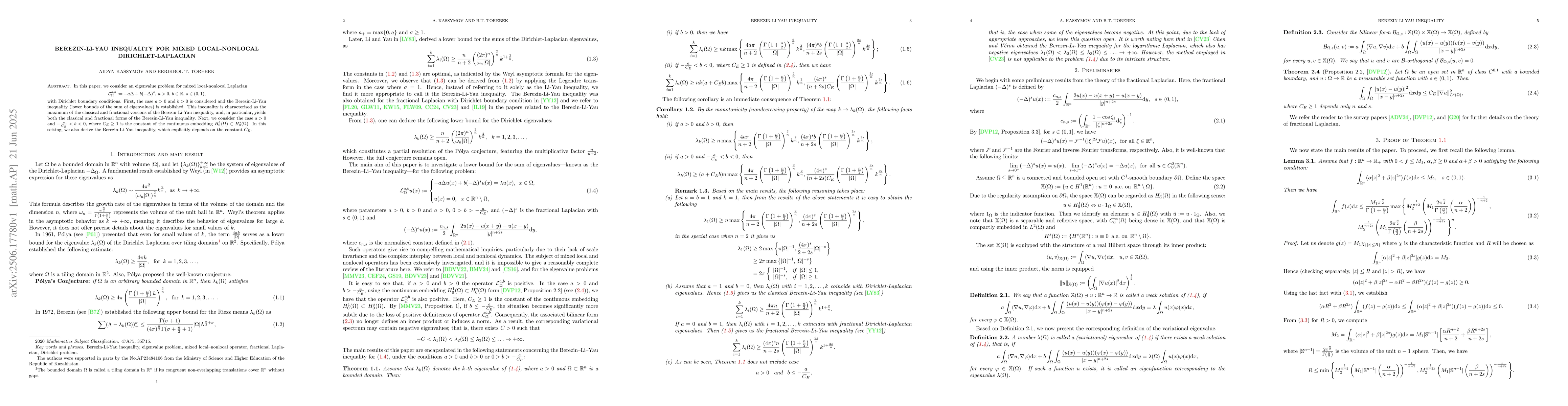 In this paper, we consider an eigenvalue problem for mixed local-nonlocal Laplacian $$\mathcal{L}^{a,b}_{\Om}:=-a\Delta+b(-\Delta)^s,\,a>0,\,b\in\mathbb{R},\,s\in (0,1),$$ with Dirichlet boundary conditions. First, the case $a>0$ and $b>0$ is considered and the Berezin-Li-Yau inequality (lower bounds of the sum of eigenvalues) is established. This inequality is characterised as the maximum of the classical and fractional versions of the Berezin-Li-Yau inequality, and, in particular, yields both the classical and fractional forms of the Berezin-Li-Yau inequality. Next, we consider the case $a>0$ and $-\frac{a}{C_E}