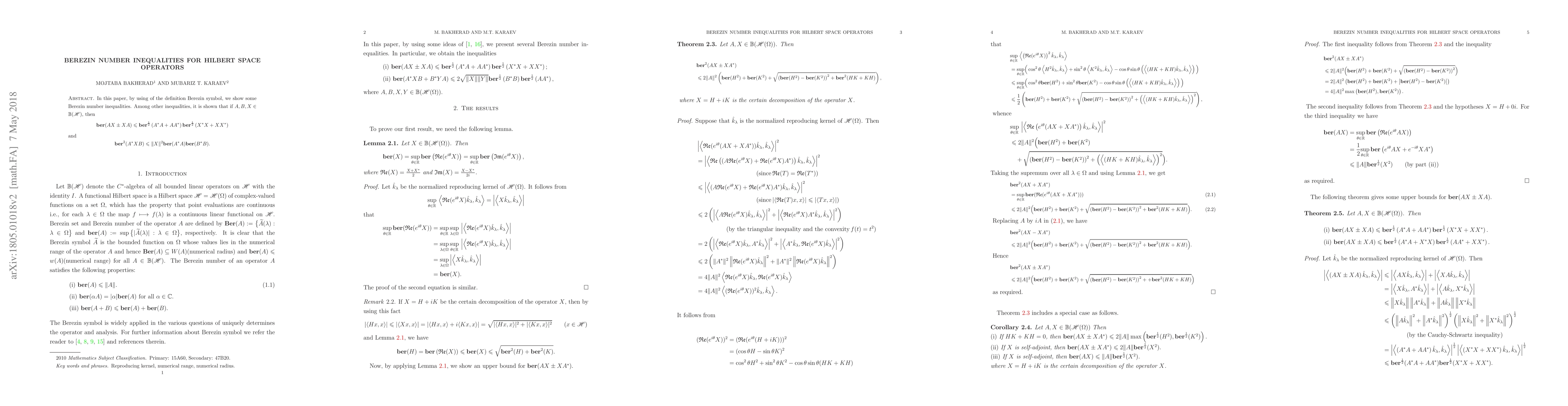 In this paper, by using of the definition Berezin symbol, we show some Berezin number inequalities. Among other inequalities, it is shown that if $A, B, X\in{\mathbb{B}}(\mathscr H)$, then $$\mathbf{ber}(AX\pm XA)\leqslant \mathbf{ber}^{\frac{1}{2}}\left(A^*A+AA^*\right)\mathbf{ber}^{\frac{1}{2}}\left(X^*X+XX^*\right)$$ and $$\mathbf{ber}^2(A^*XB)\leqslant\|X\|^2\mathbf{ber}(A^*A)\mathbf{ber}(B^*B).$$