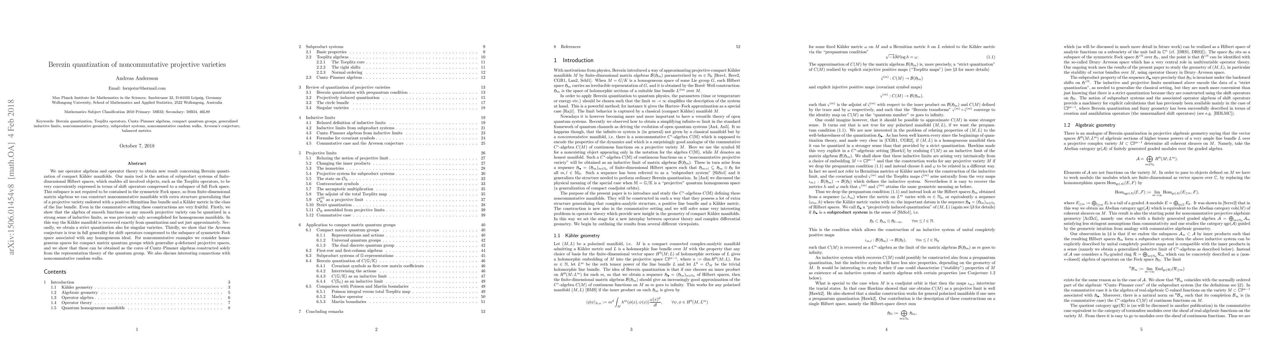 This paper develops Berezin quantization for noncommutative projective varieties using subproduct systems of finite-dimensional Hilbert spaces, allowing the construction of noncommutative manifolds generalizing projective varieties with Hermitian line bundles. It shows strong quantization for smooth projective varieties and verifies the Arveson conjecture for shift operators in symmetric Fock space, with applications to compact matrix quantum groups and noncommutative random walks.