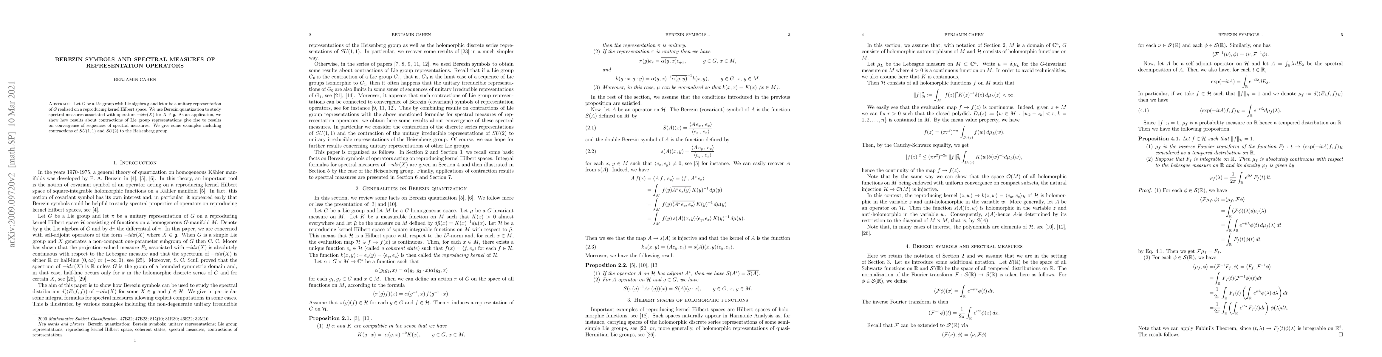 Let $G$ be a Lie group with Lie algebra $\mathfrak g$ and let $\pi$ be a unitary representation of $G$ realized on a reproducing kernel Hilbert space. We use Berezin quantization to study spectral measures associated with operators $-id\pi(X)$ for $X\in {\mathfrak g}$. As an application, we show how results about contractions of Lie group representations give rise to results on convergence of sequences of spectral measures. We give some examples including contractions of $SU(1,1)$ and $SU(2)$ to the Heisenberg group.