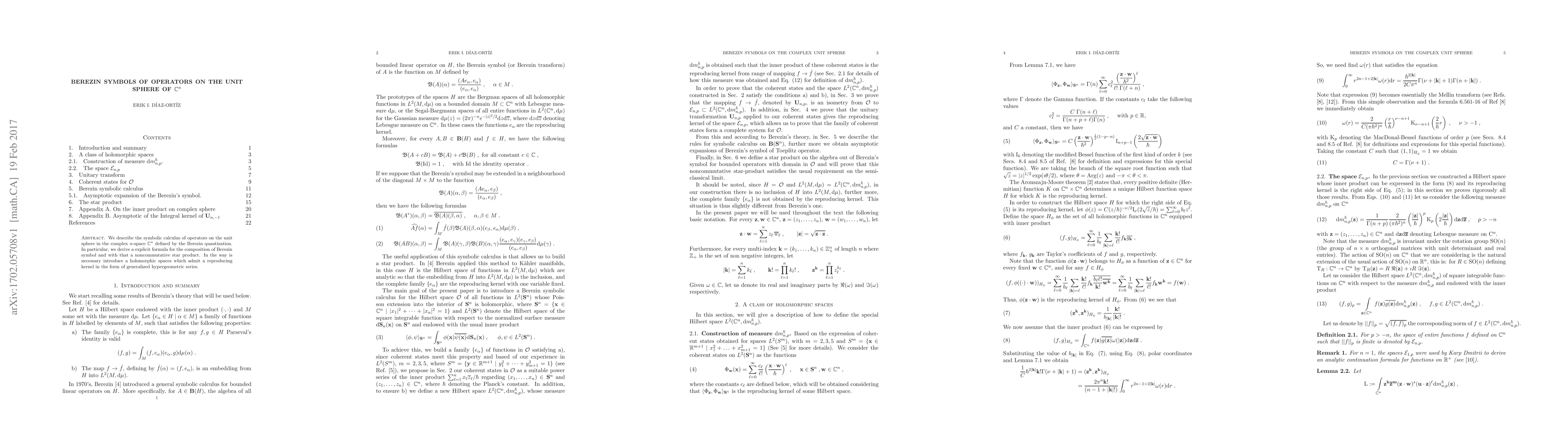 We describe the symbolic calculus of operators on the unit sphere in the complex n-space $\mathbb C^n$ defined by the Berezin quantization. In particular, we derive a explicit formula for the composition of Berezin symbol and with that a noncommutative star product. In the way is necessary introduce a holomorphic spaces which admit a reproducing kernel in the form of generalized hypergeometric series.