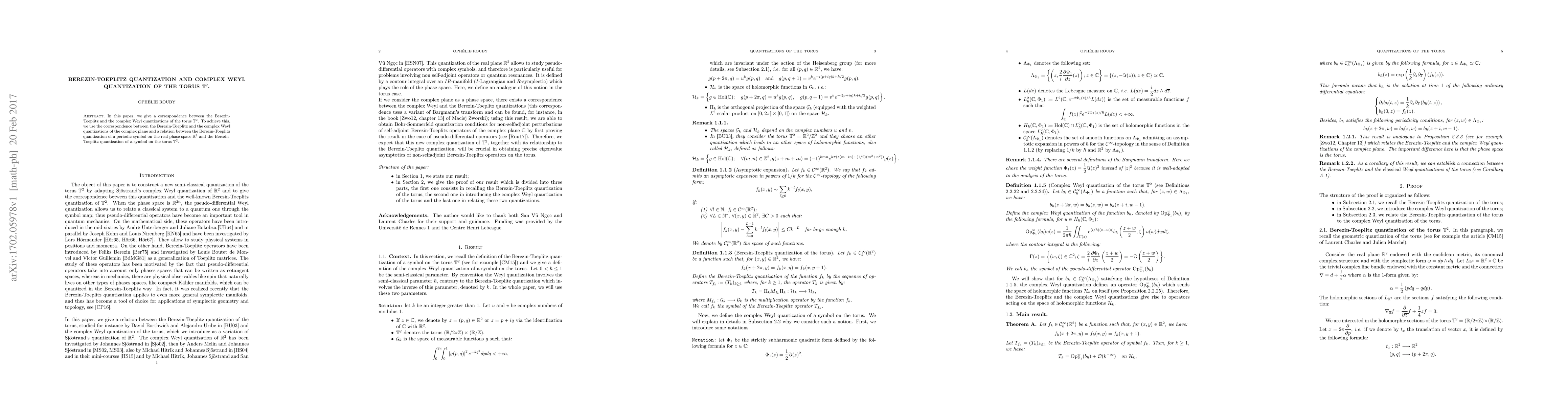 This paper establishes a correspondence between Berezin-Toeplitz and complex Weyl quantizations for the torus $\mathbb{T}^2$, leveraging relationships from the complex plane and periodic symbols on $\mathbb{R}^2$.