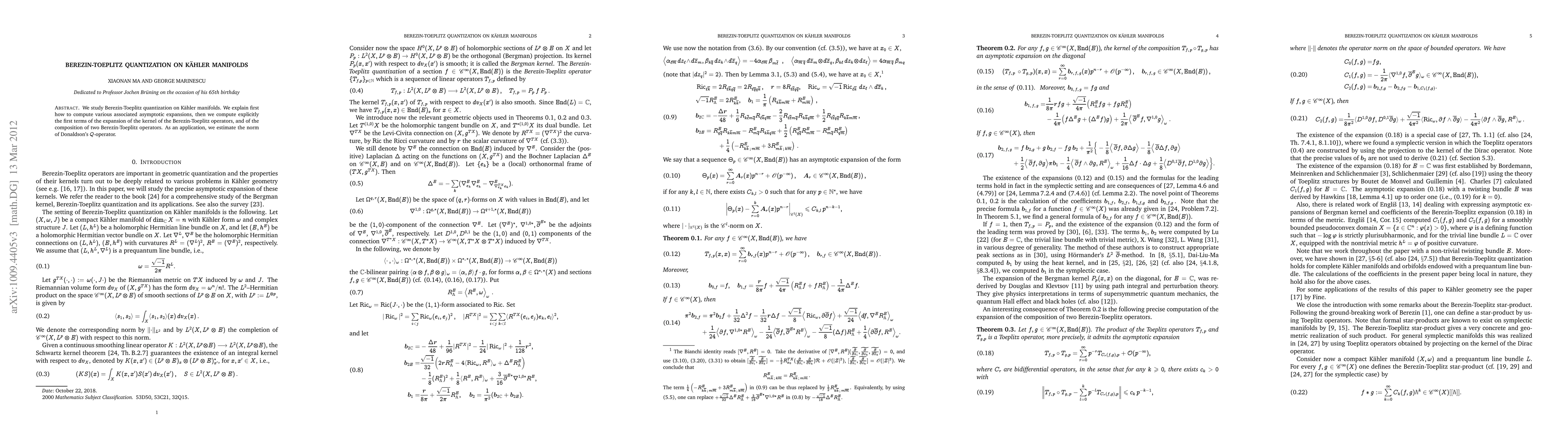 This paper investigates the Berezin-Toeplitz quantization on Kaehler manifolds, detailing the computation of asymptotic expansions and explicitly calculating the initial terms of the kernel expansion for Berezin-Toeplitz operators and their compositions. An application includes an estimation of the norm of Donaldson's Q-operator.