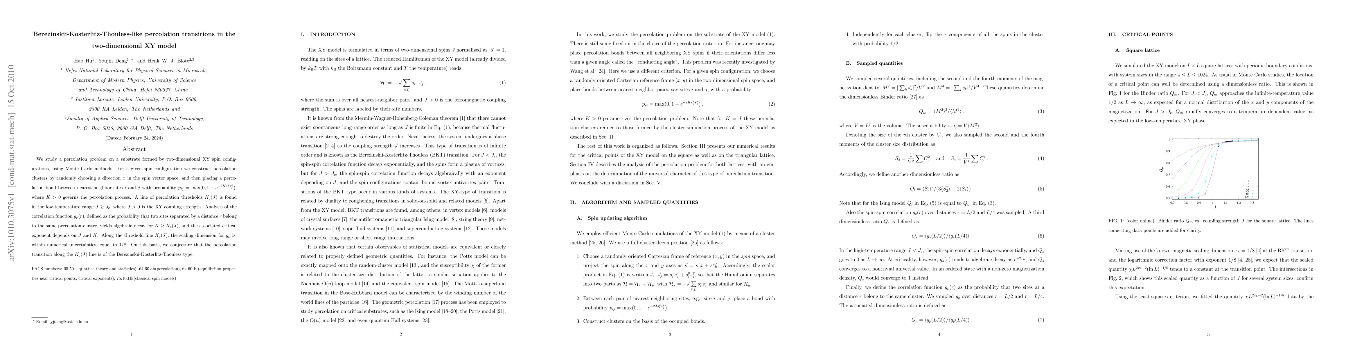 This paper investigates percolation transitions in a two-dimensional XY model using Monte Carlo methods, finding a line of percolation thresholds in the low-temperature regime. The correlation function exhibits algebraic decay, suggesting a Berezinskii-Kosterlitz-Thouless-like transition with a critical exponent dependent on the XY coupling strength and percolation parameter.