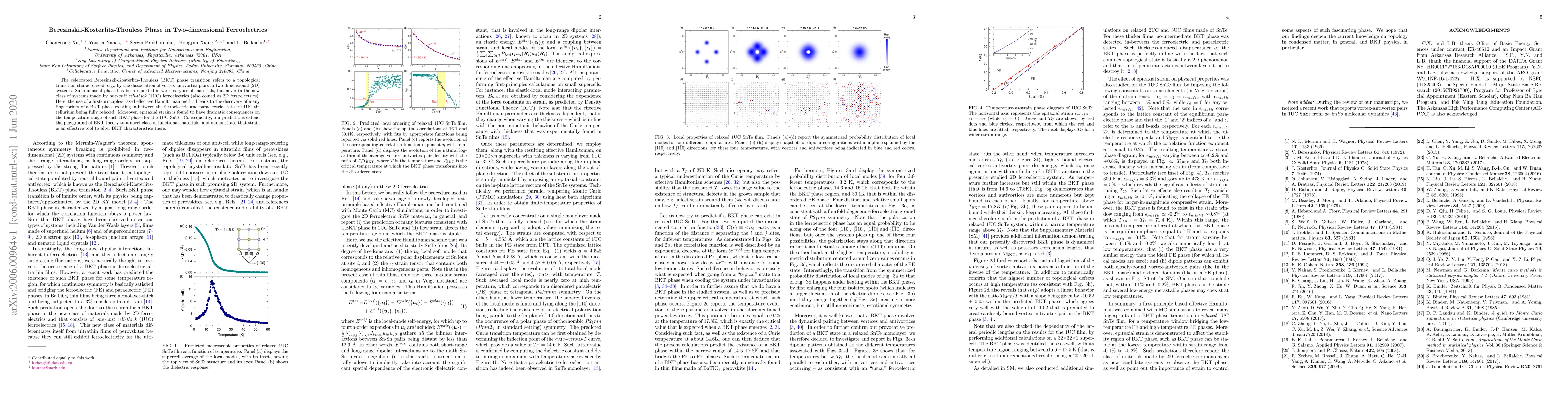 This paper discovers the Berezinskii-Kosterlitz-Thouless (BKT) phase transition in one-unit-cell-thick ferroelectrics, specifically in 1UC SnTe, using a first-principles-based effective Hamiltonian method. The study reveals that epitaxial strain significantly influences the temperature range of the BKT phase, expanding the applicability of BKT theory to novel ferroelectric materials.