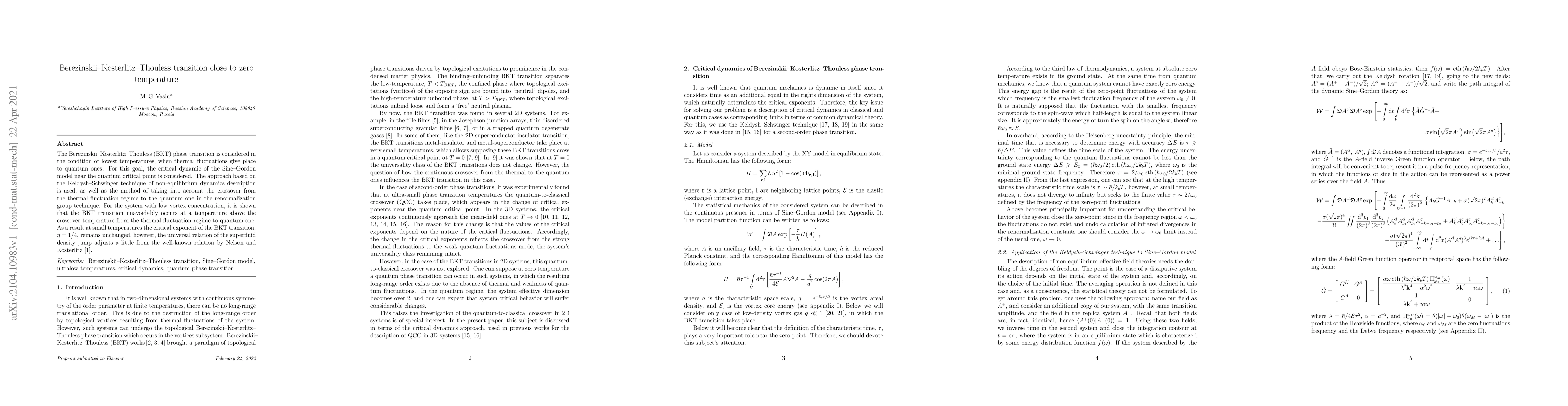 The Berezinskii-Kosterlitz-Thouless (BKT) phase transition is considered in the condition of lowest temperatures, when thermal fluctuations give place to quantum ones. For this goal, the critical dynamic of the Sine-Gordon model near the quantum critical point is considered. The approach based on the Keldysh-Schwinger technique of non-equilibrium dynamics description is used, as well as the method of taking into account the crossover from the thermal fluctuation regime to the quantum one in the renormalization group technique. For the system with low vortex concentration, it is shown that the BKT transition unavoidably occurs at a temperature above the crossover temperature from the thermal fluctuation regime to quantum one. As a result at small temperatures the critical exponent of the BKT transition, $\eta=1/4$, remains unchanged, however, the universal relation of the superfluid density jump adjusts a little from the well-known relation by Nelson and Kosterlitz.
