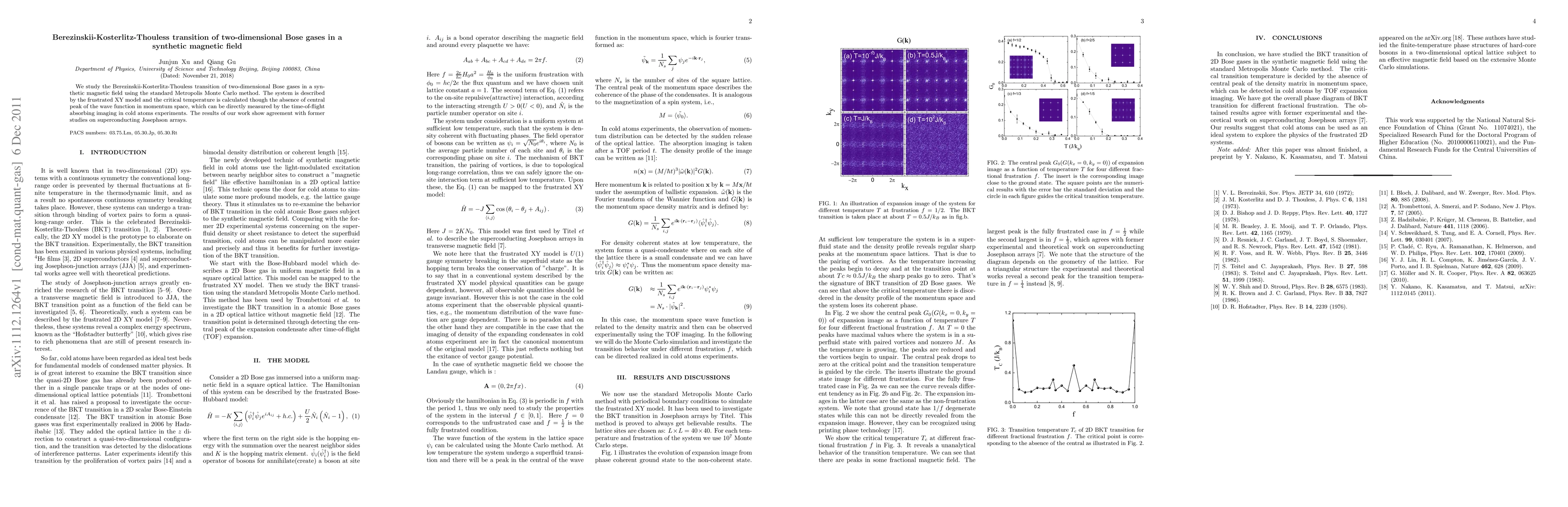 This study investigates the Berezinskii-Kosterlitz-Thouless transition in two-dimensional Bose gases under a synthetic magnetic field using the Metropolis Monte Carlo method. The critical temperature is determined by the absence of a central peak in momentum space, which aligns with cold atom experiments.