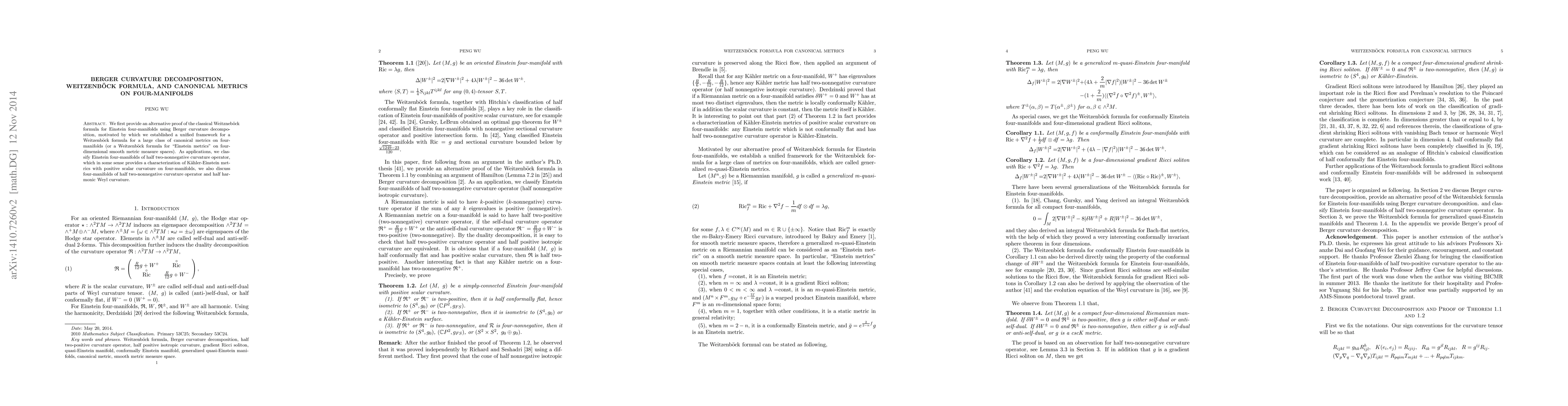 This paper presents an alternative proof of the Weitzenböck formula for Einstein four-manifolds using Berger curvature decomposition, establishing a unified framework for a broad class of canonical metrics. It classifies Einstein four-manifolds with half two-nonnegative curvature operator, offering a characterization of Kähler-Einstein metrics with positive scalar curvature.