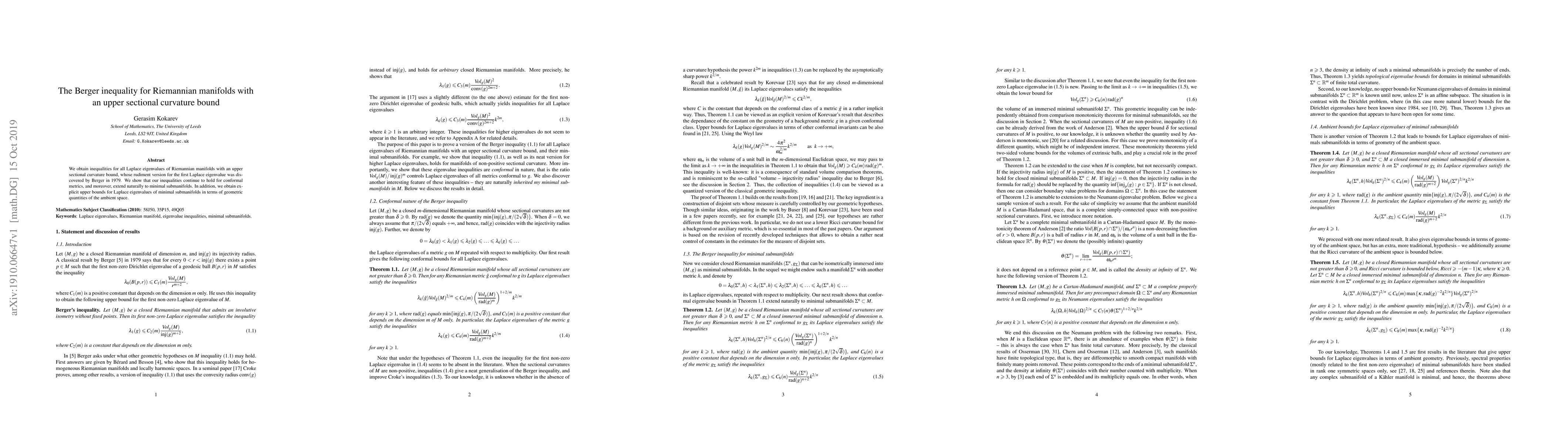 We obtain inequalities for all Laplace eigenvalues of Riemannian manifolds with an upper sectional curvature bound, whose rudiment version for the first Laplace eigenvalue was discovered by Berger in 1979. We show that our inequalities continue to hold for conformal metrics, and moreover, extend naturally to minimal submanifolds. In addition, we obtain explicit estimates for Laplace eigenvalues of minimal submanifolds in terms of geometric quantities of the ambient space.