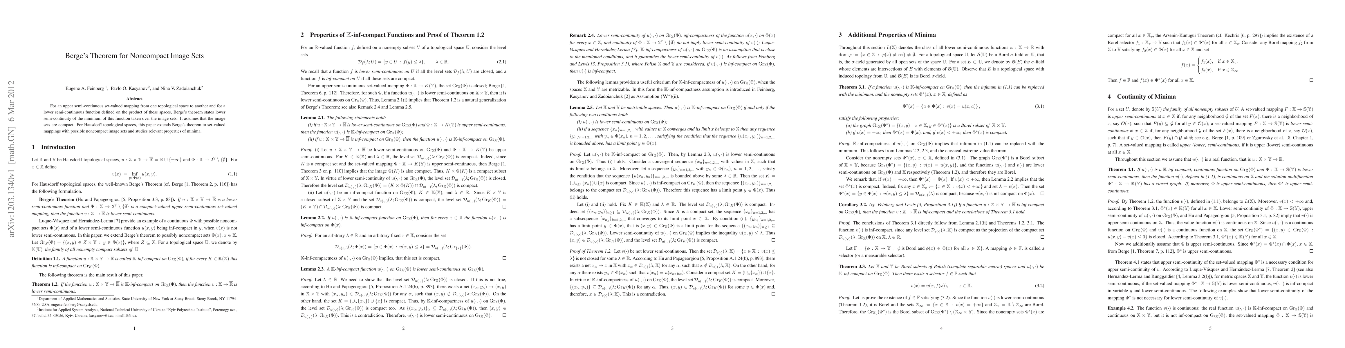 For an upper semi-continuous set-valued mapping from one topological space to another and for a lower semi-continuous function defined on the product of these spaces, Berge's theorem states lower semi-continuity of the minimum of this function taken over the image sets. It assumes that the image sets are compact. For Hausdorff topological spaces, this paper extends Berge's theorem to set-valued mappings with possible noncompact image sets and studies relevant properties of minima.